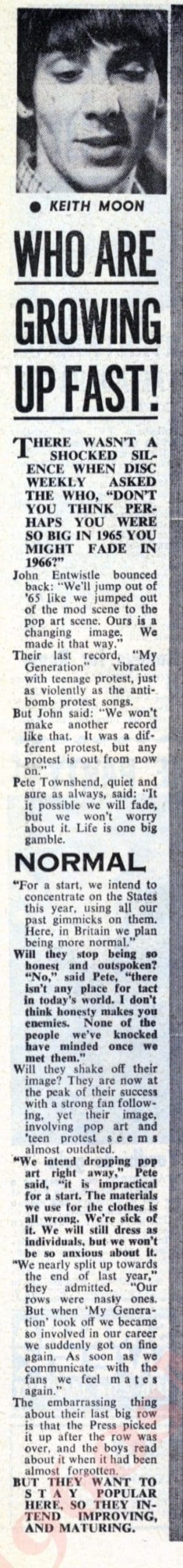 | Saturday, January 8, 1966 Disc magazine reports that Pete says The Who are dropping the Pop Art look in an article called “WhoRead More »1966-01-08 |