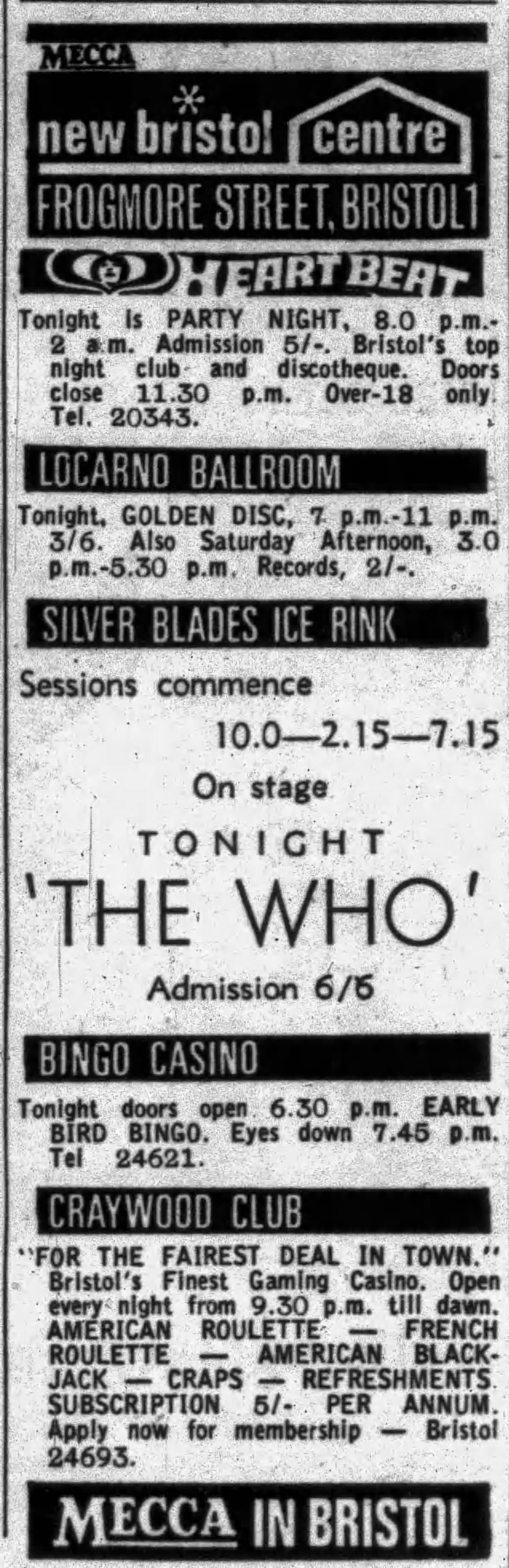 | Monday, January 8, 1968 The Who play at the Silver Blades Ice Rink in Bristol |