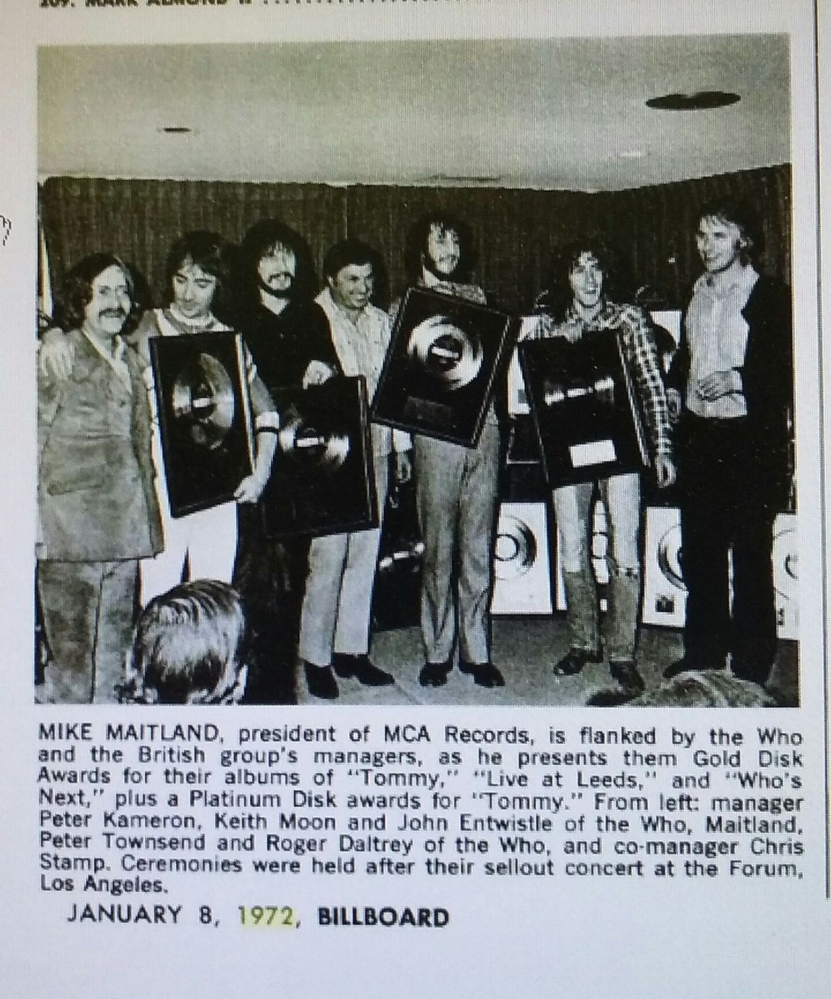 | Saturday, January 8, 1972 Billboard magazine carries a photo of The Who receiving their gold discs for Tommy |