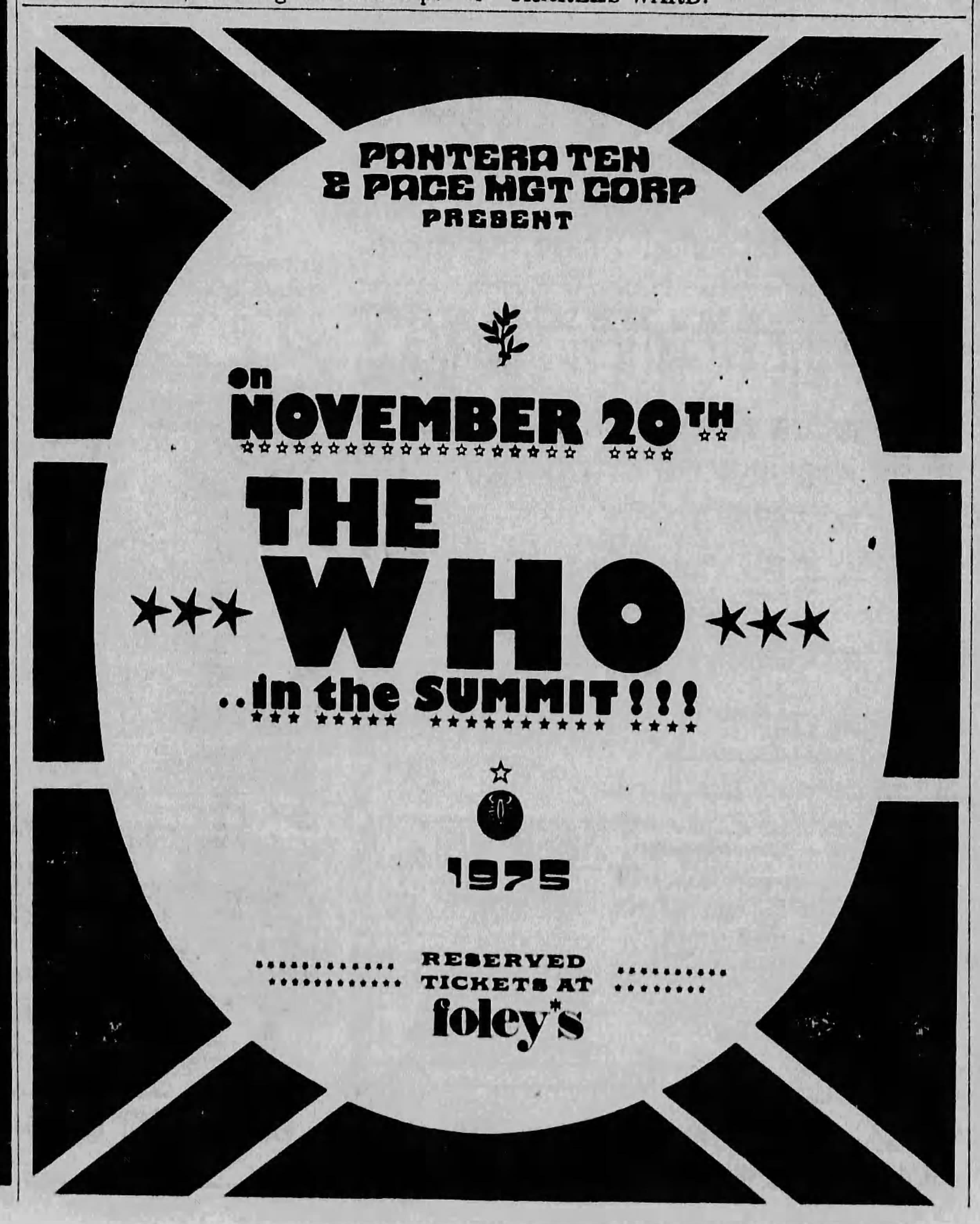 | Thursday, November 20, 1975 The Who begin their 1975 North American tour in Houston at The Summit |