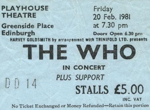 | Friday, February 20, 1981 The Who play the second of two nights at the Edinburgh Playhouse in Edinburgh, Midlothian |