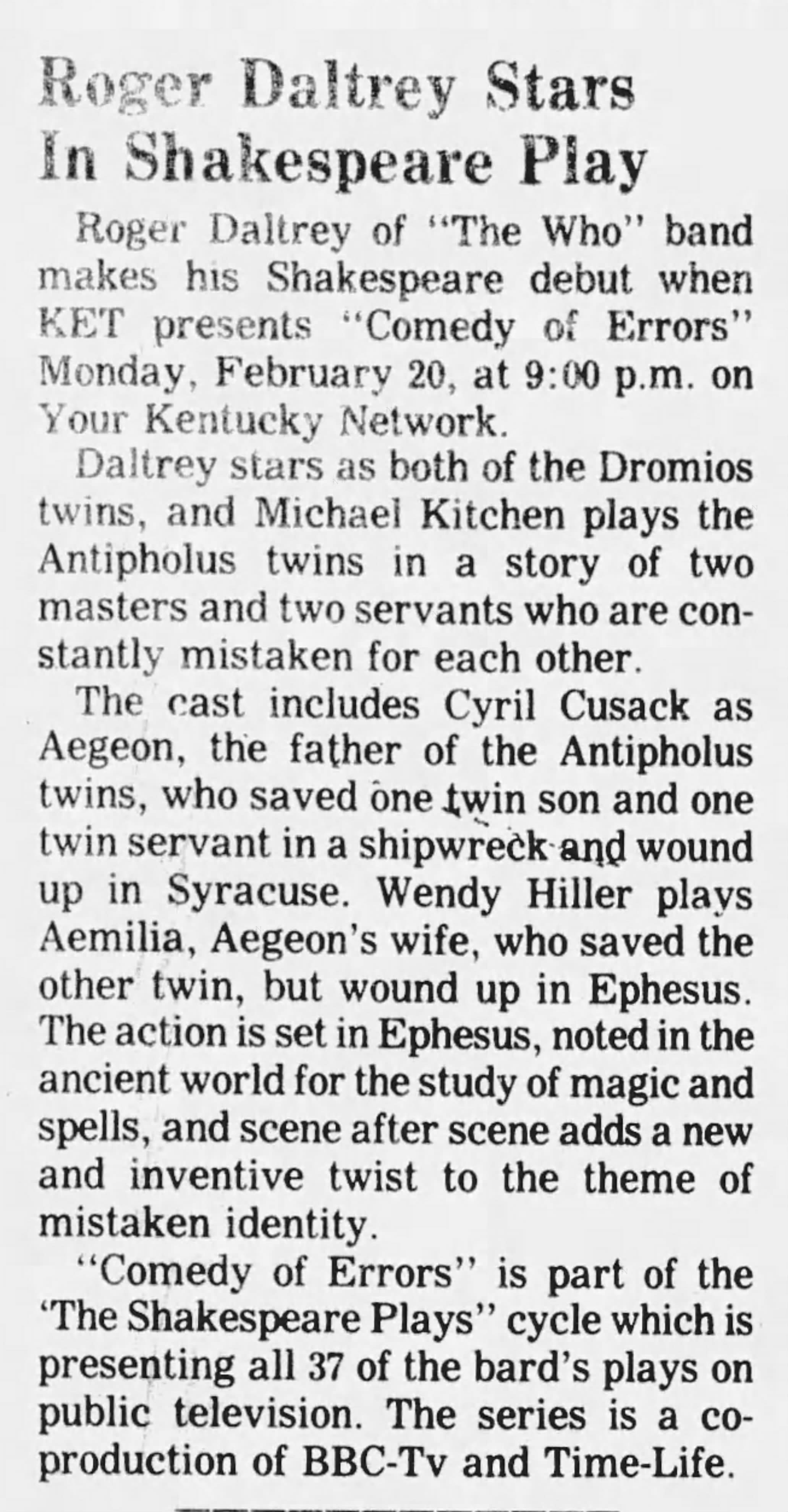 | Monday, February 20, 1984 Public Broadcasting in the U.S. shows the BBC-TV production of Shakespeare’s The Comedy Of Errors stRead More »1984-02-20 |