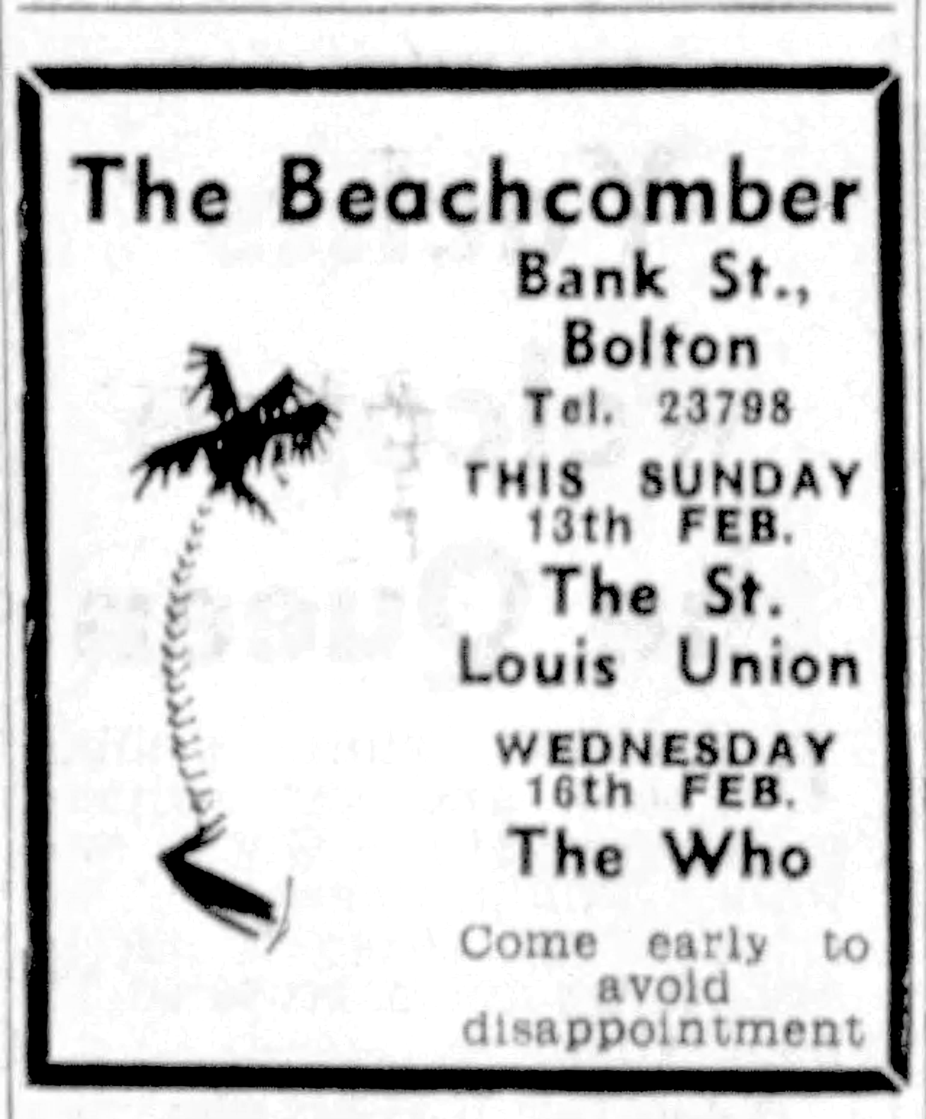 | Wednesday, February 16, 1966 The Who play the Beachcomber in Bolton This show is not listed in Anyway, Anyhow, Anywhere, howeverRead More »1966-02-16 |