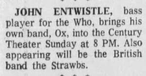 | Wednesday, January 22, 1975 John Entwistle and his band Ox play Mountford Hall at Liverpool University |