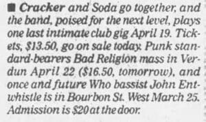 Newspaper listing for John Entwistle's March 26, 1996 concert