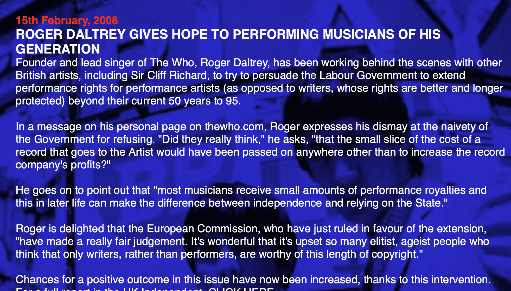 | Saturday, February 16, 2008 Roger Daltrey writes for TheWho.com about his current campaign with other British performing artistsRead More »2008-02-16 |
