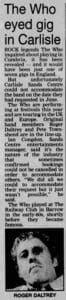 The press reports that a request by The Who to perform at Carlisle's Sands Centre on 18 June has been denied as the Centre is booked on that date for a karate championship.