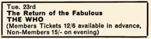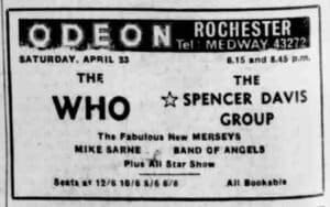 The Who play the University of Strathclyde Student Union in Glasgow. Jimmy James and the Vagabonds and Fred's Jazz Band open the show.