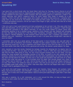 Pete publicly apologizes to John Entwistle's mother Queenie for some remarks he made about John in the previous month's issue of Uncut magazine.