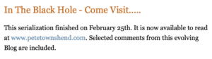 Once again, this website has been experiencing some issues that I’ve only now had time to address. There have been problems with “registration” and with “Log In”. I believe I’ve resolved these two issues for the time being! If you’ve registered, please try to log in! If you tried registering and hadn’t received an email to “activate”, it should now work properly. Please feel free to email me at webmaster@thewho.net if you have any problems!