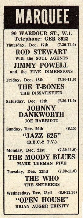 Tuesday, December 22nd, 1964 The Who play the Marquee Club in London. « 1964-12-21 1964-12-23 » Comments Leave a Reply Cancel replyYou must be logged in to post a comment. This site uses Akismet to reduce spam. Learn how your comment data is processed. Map Venue The Marquee Club I was there Latitude: 51.513296 Longitude: -0.133746 For more information on The Who’s history and concerts visit our friends www.thewhothismonth.com www.thewholive.com