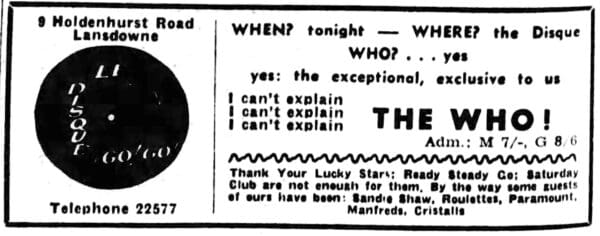 Wednesday, March 3rd, 1965 The Who play Le Disque a Go!Go! Club in Lansdowne, Bournemouth, Hampshire « 1965-03-02 1965-03-04 » Comments Leave a Reply Cancel replyYou must be logged in to post a comment. This site uses Akismet to reduce spam. Learn how your comment data is processed. Map Venue Le Disque a Go!Go! Club I was there Latitude: 50.722479 Longitude: -1.865535 For more information on The Who’s history and concerts visit our friends www.thewhothismonth.com www.thewholive.com