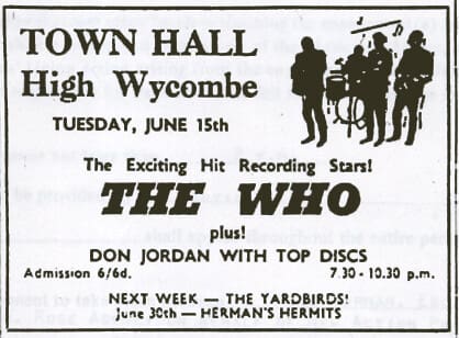 Tuesday, June 15th, 1965 The Who play Town Hall in High Wycomb « 1965-06-13 1965-06-16 » Comments Leave a Reply Cancel replyYou must be logged in to post a comment. This site uses Akismet to reduce spam. Learn how your comment data is processed. Map Venue Town Hall, High Wycomb I was there Latitude: 51.627919 Longitude: -0.748982 For more information on The Who’s history and concerts visit our friends www.thewhothismonth.com www.thewholive.com