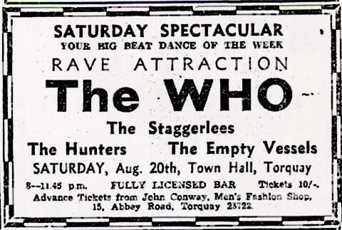 Saturday, August 20th, 1966 The Who play the Town Hall in Torquay, Devonshire « 1966-08-18 1966-08-21 » Comments Leave a Reply Cancel replyYou must be logged in to post a comment. This site uses Akismet to reduce spam. Learn how your comment data is processed. Map Venue Town Hall, Torquay I was there Latitude: 50.468389 Longitude: -3.531771 For more information on The Who’s history and concerts visit our friends www.thewhothismonth.com www.thewholive.com