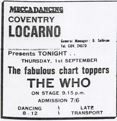Thursday, September 1st, 1966 The Who play the Locarno Ballroom in Coventry « 1966-08-26 1966-09-02 » Comments Leave a Reply Cancel replyYou must be logged in to post a comment. This site uses Akismet to reduce spam. Learn how your comment data is processed. Map Venue Locarno Ballroom, Coventry I was there Latitude: 52.408725 Longitude: -1.513030 For more information on The Who’s history and concerts visit our friends www.thewhothismonth.com www.thewholive.com