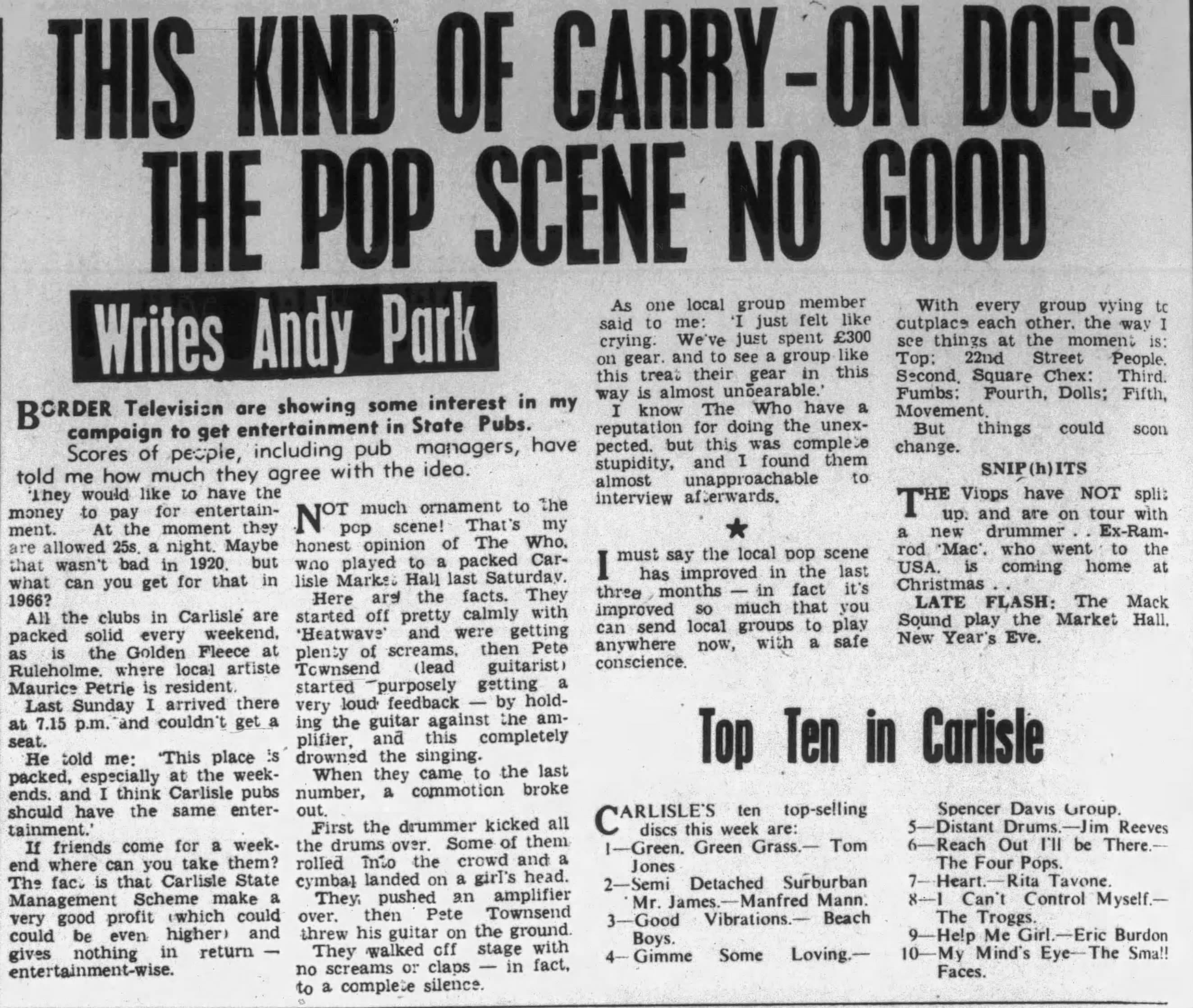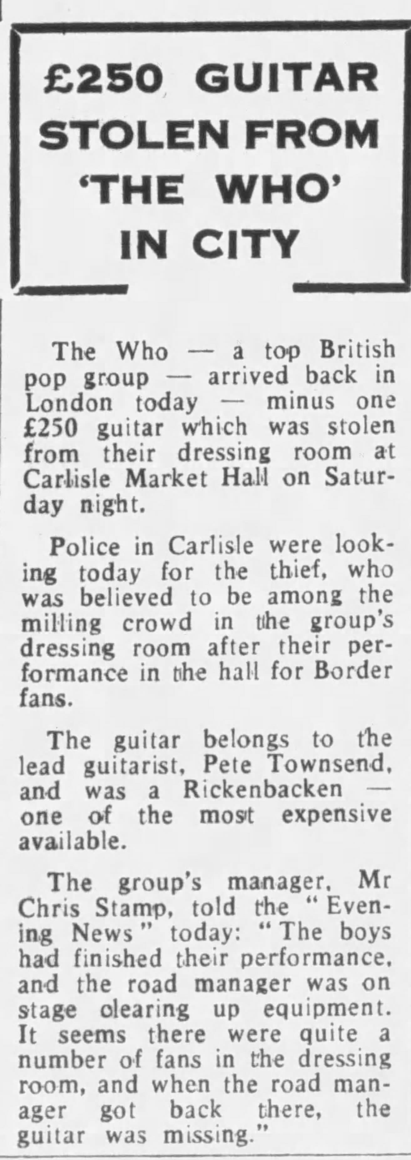 The Who play the Market Hall in Carlisle. Pete's Rickenbacker is stolen after the show but is later recovered.