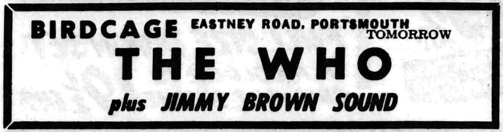 Saturday, February 4th, 1967 The Who play the Birdcage Club in Portsmouth, Hampshire « 1967-02-02 1967-02-10 » Photos Comments Leave a Reply Cancel replyYou must be logged in to post a comment. This site uses Akismet to reduce spam. Learn how your comment data is processed. Map Venue Birdcage Club, Portsmouth I was there Latitude: 50.789320 Longitude: -1.055202 For more information on The Who’s history and concerts visit our friends www.thewhothismonth.com www.thewholive.com