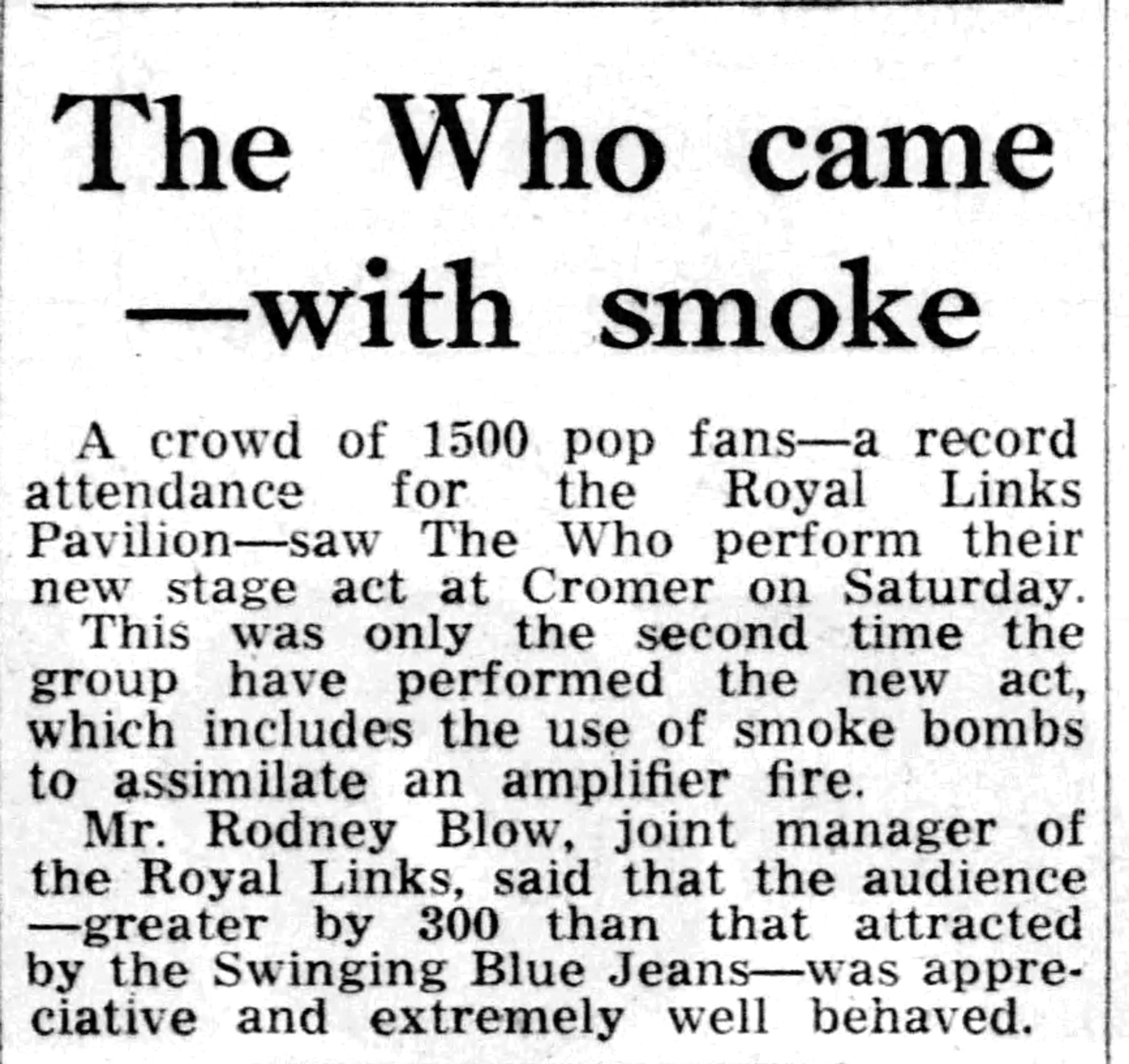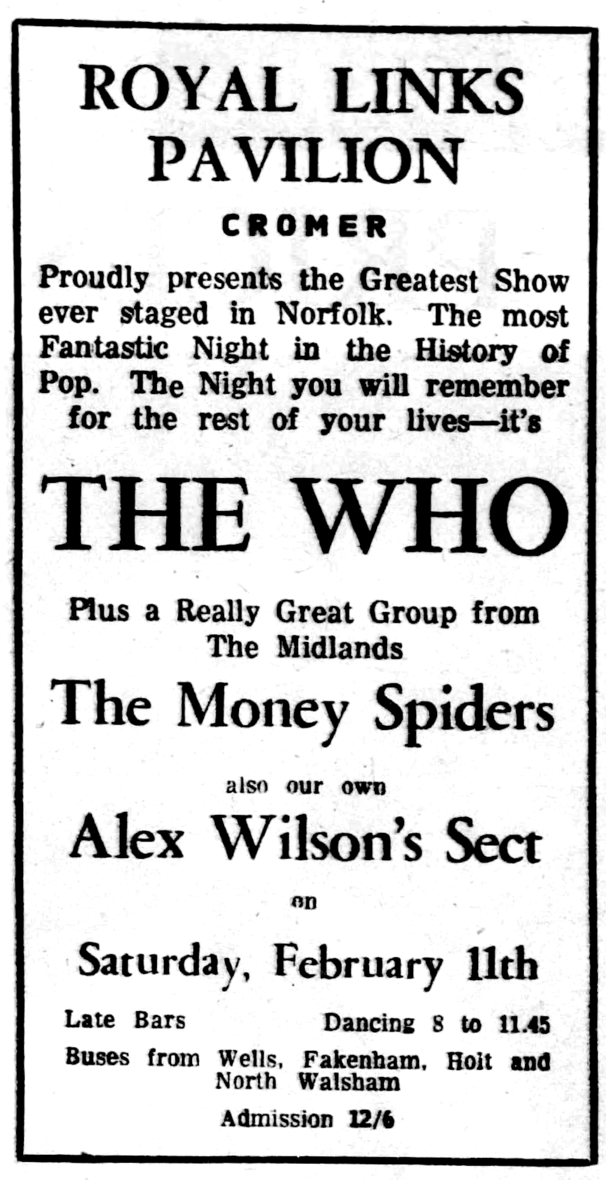 The Who play the Royal Links Pavilion in Cromer with supporting acts The Money Spiders and Alex Wilson's Sect