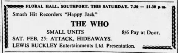 Saturday, February 18th, 1967 The Who play Floral Hall in Southport, Lancashire « 1967-02-12 1967-02-23 » Photos Comments Leave a Reply Cancel replyYou must be logged in to post a comment. This site uses Akismet to reduce spam. Learn how your comment data is processed. Map Venue Floral Hall, Southport I was there Latitude: 53.651919 Longitude: -3.005962 For more information on The Who’s history and concerts visit our friends www.thewhothismonth.com www.thewholive.com