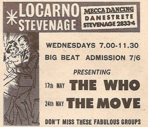 After a week off from gigs following their mini tour of Scandinavia, The Who are back on the circuit again playing a gig at Mod stronghold, the Locarno Ballroom in Stevenage, Hertfordshire. By 1967 the cult of Mod had pretty much run its course and with the burgeoning Summer of Love about to unfold, The Who were glad to have shed their Mod image. The manager of the Locarno, Maurice de Jonge, was not particularly impressed with the 'Orrible 'Oo. Speaking to a reporter from the Stevenage News he said, "Ridiculous! If they have to smash everything to get a reaction, then you certainly won't see them here again . . . We would certainly think twice about booking them again." All of which seems a bit odd considering this was the group's sixth appearance here. Perhaps Mr de Jonge kept his word as The Who were never to play here again. Meanwhile backstage, John broke a finger on his right hand after punching a poster of a 'well-known band' pinned to the dressing room wall.