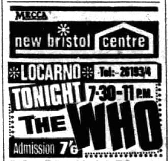 The Who play the Locarno ballroom in Bristol and the third time The Who played here. Despite John's broken finger (see yesterday's post about this), the group did appear despite rumours to the contrary.