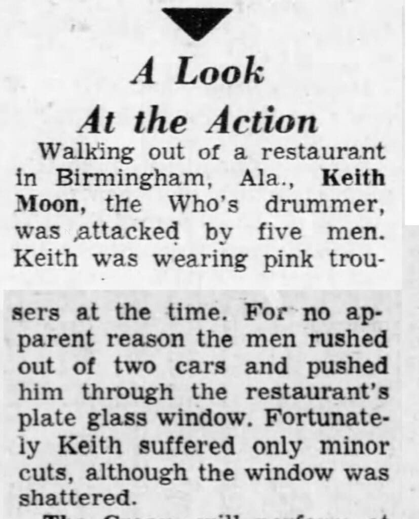 The Who play the Municipal Auditorium in Birmingham, Alabama. Earlier in the day Keith leaves the hotel, attracting the attention of some local toughs who shove the British "longhair" through a plate glass window.