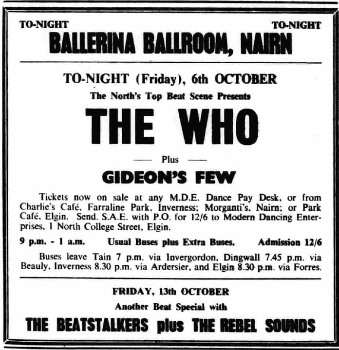 The Who play the Ballerina Ballroom in Nairn, Nairnshire, Scotland with Gideon’s Few opening