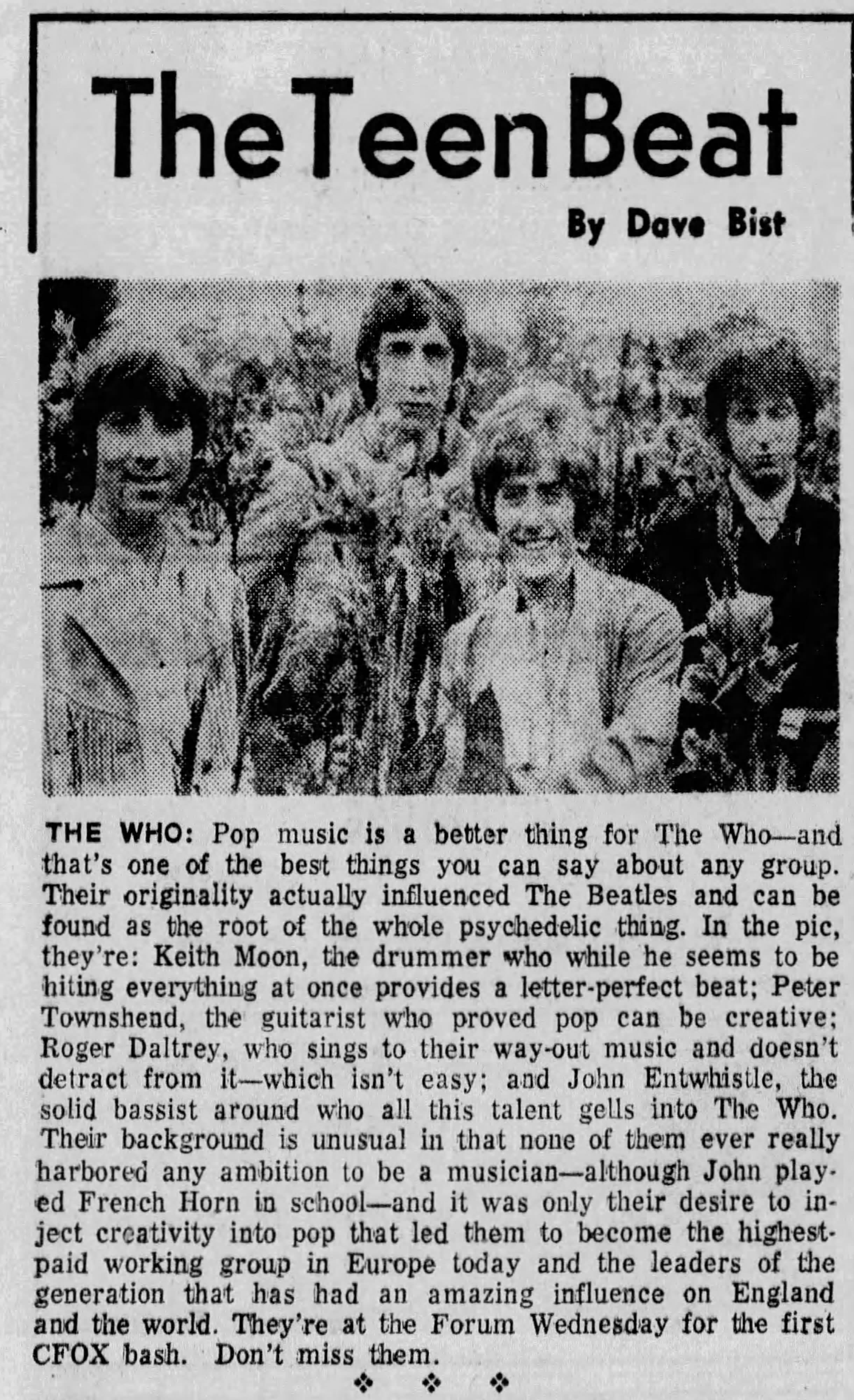 The Who play the Montreal Forum in Montreal, Quebec, Canada. Opening for them is The Troggs making their North American debut.