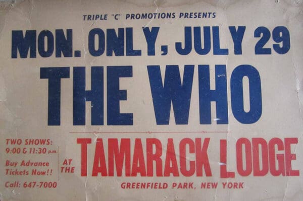 Monday, July 29th, 1968 The Who play the Tamarack Lodge in Greenfield Park, New York « 1968-07-28 1968-07-31 » Comments Leave a Reply Cancel replyYou must be logged in to post a comment. This site uses Akismet to reduce spam. Learn how your comment data is processed. Map Venue Tamarack Lodge, Greenfield Park I was there Latitude: 41.734236 Longitude: -74.504040 For more information on The Who’s history and concerts visit our friends www.thewhothismonth.com www.thewholive.com