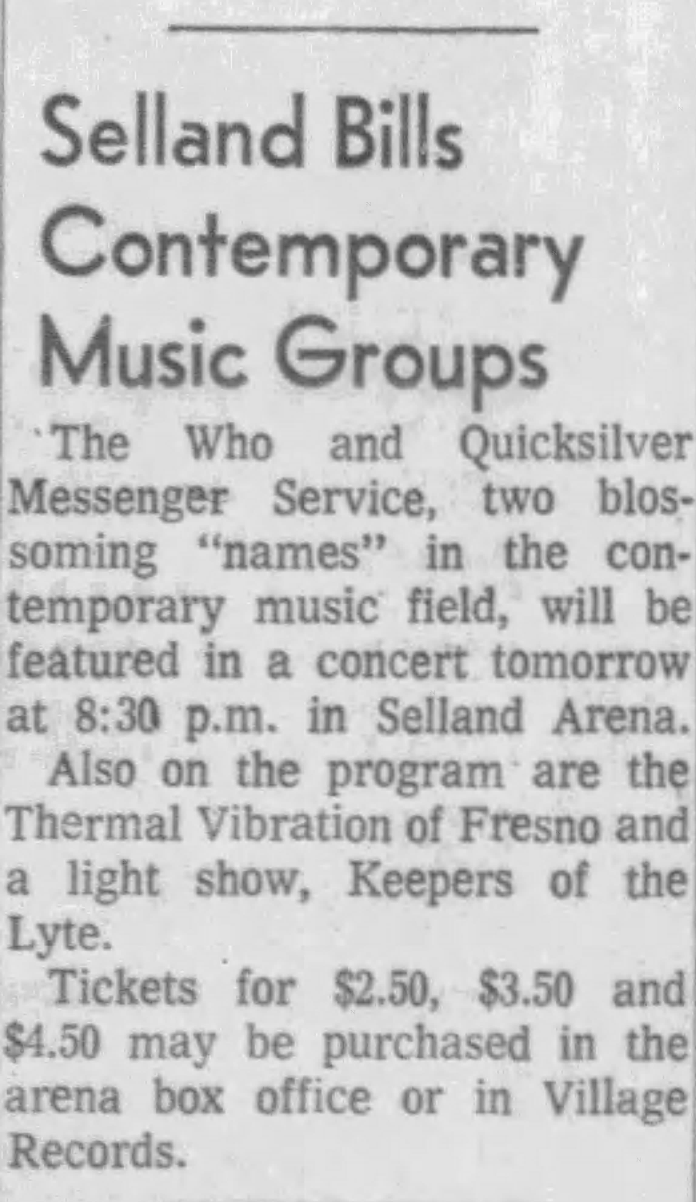 Friday, August 16th, 1968 The Who play the Selling Arena in Fresno, California « 1968-08-15 1968-08-17 » Newspapers 1968-08-11-The_Fresno_Bee 1968-08-15-The_Fresno_Bee Comments Leave a Reply Cancel replyYou must be logged in to post a comment. This site uses Akismet to reduce spam. Learn how your comment data is processed. Map Venue Selland Arena, Fresno I was there Latitude: 36.732936 Longitude: -119.782686 For more information on The Who’s history and concerts visit our friends www.thewhothismonth.com www.thewholive.com