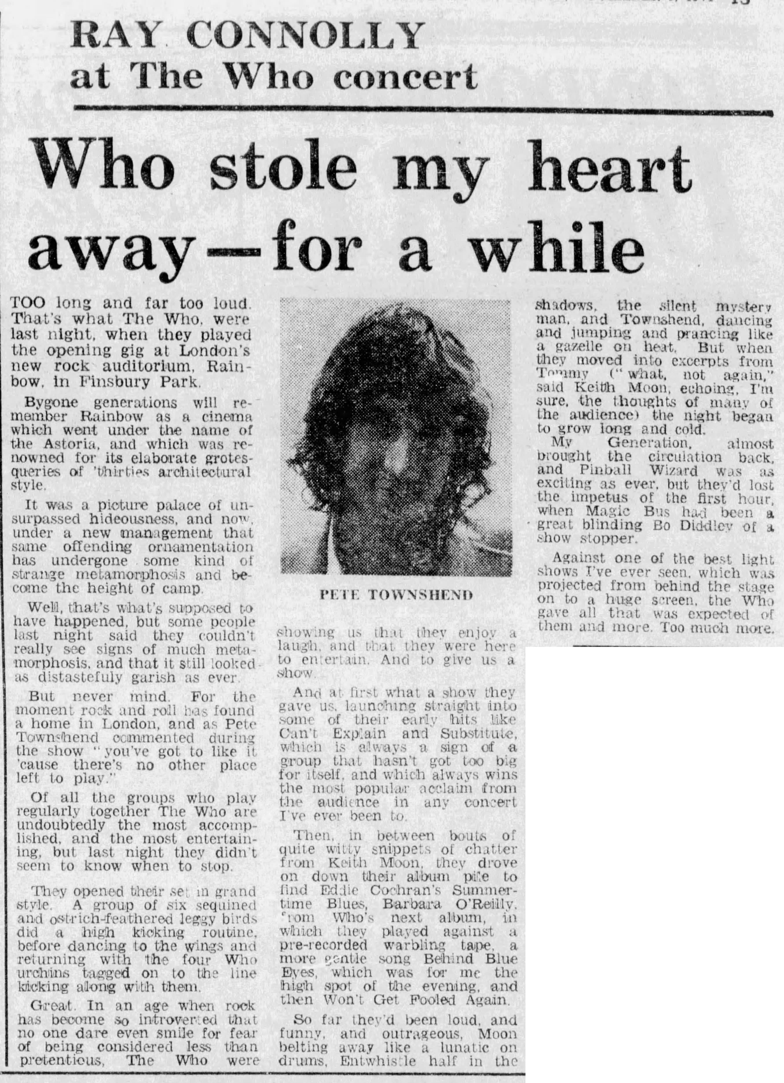 The Who open the new Rainbow Theatre in London. A chorus line of dancers precedes the show and Keith goes into the audience to yell for The Who to come on. Pete wears a silver lamé boiler suit with the Rainbow Theatre logo on the back. At the end of the show the chorus line comes back out and The Who join them for a few high kicks. Quiver is the opening act.
