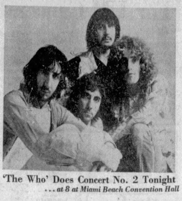 Friday, November 26th, 1971 The Who play the second of two nights at the Miami Beach Convention Hall « 1971-11-25 1971-11-28 » Comments Leave a Reply Cancel replyYou must be logged in to post a comment. This site uses Akismet to reduce spam. Learn how your comment data is processed. Map Venue Convention Center, Miami Beach I was there Latitude: 25.794993 Longitude: -80.133486 For more information on The Who’s history and concerts visit our friends www.thewhothismonth.com www.thewholive.com