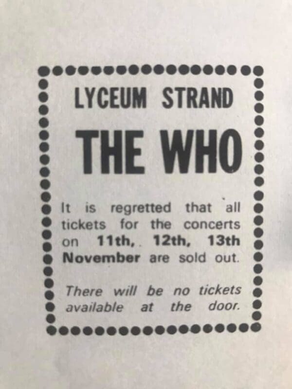 The Quadrophenia tour continues with a three-night run at the Lyceum in London. Problems continue as the venue proves to be too small for The Who's gigantic stage rig, eliminating good seats in a venue that already had too few decent sightlines of the stage. This causes a crush to the front resulting in some twenty fans passing out from the pressure. The Who are forced to stop temporarily after the first three numbers so order can be restored.