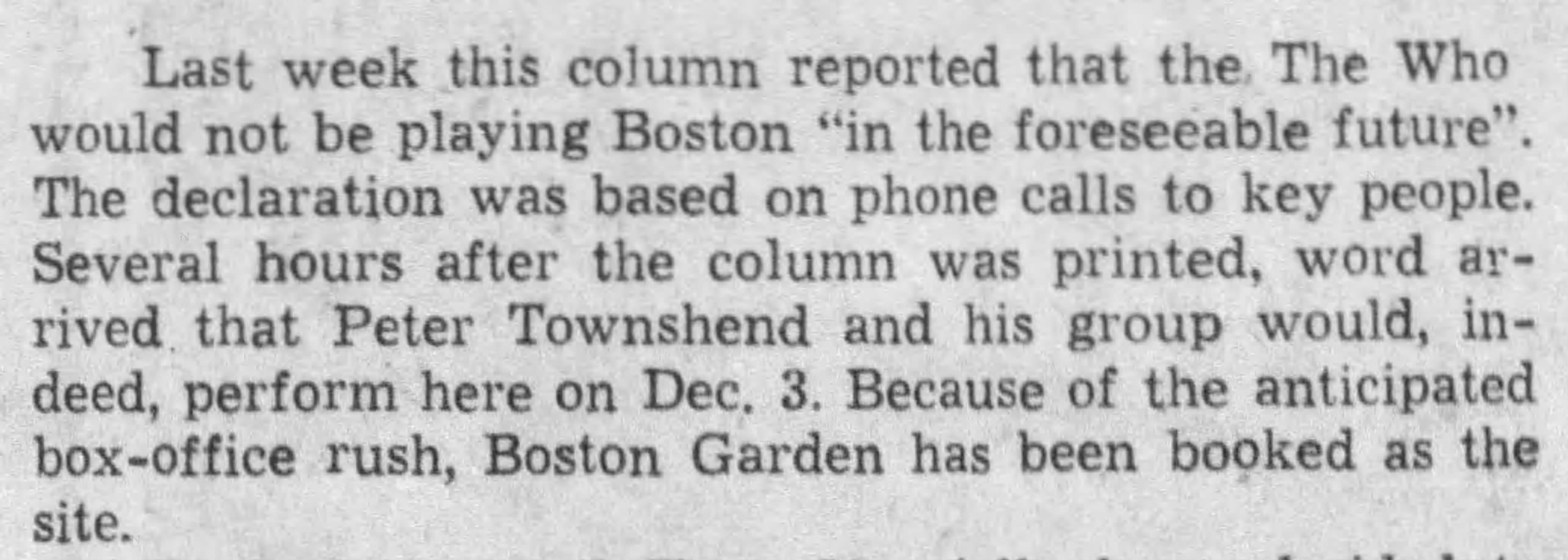 The Who play The Boston Garden and yet another song is dropped from the live Quadrophenia. “Helpless Dancer,” which had featured a horn performance by John, is excised for the rest of the tour.