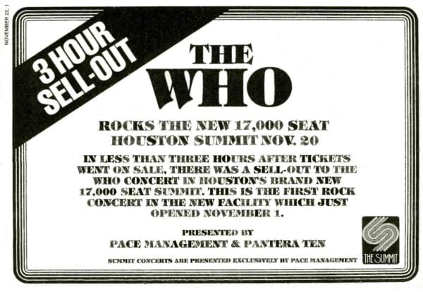 The Who begin their 1975 North American tour in Houston at The Summit. .John Entwistle gets caught between the pincers of Roger telling him to turn his volume down and Pete telling him to turn it up. Frustrated, John smashes the head off his bass in the middle of the last song and walks off the stage. It takes some cajoling to get him to return for the final bow. Tensions are relieved at an after-show party that turns into an orgy. Keith and some others in The Who's entourage are photographed being orally serviced by topless groupies. The cops are called in and John and stage manager John “Wiggy “ Wolff are arrested for allegedly assaulting the police. John, wearing a Confederate officer's uniform finds the policeman who has arrested him shares his last name. When John tells him his name is also Entwistle, the policeman thinks John is making fun of him! The two Johns are soon released