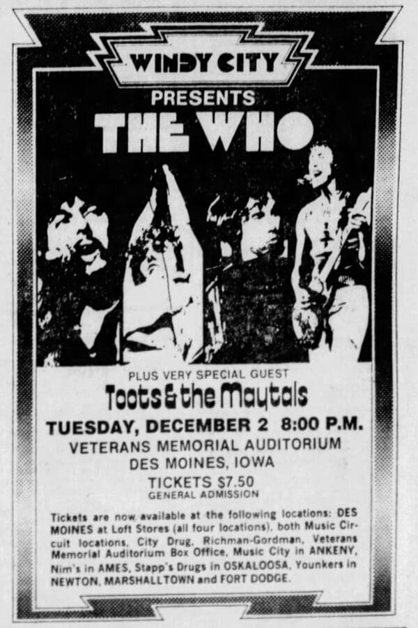 Tuesday, December 2nd, 1975 The Who play the Veterans Memorial Auditorium in Des Moines, Iowa « 1975-12-01 1975-12-04 » Newspapers 1975-12-03 – The Des Moines Register Comments Leave a Reply Cancel replyYou must be logged in to post a comment. This site uses Akismet to reduce spam. Learn how your comment data is processed. Map Venue Veterans Memorial Auditorium, Des Moines I was there Latitude: 41.592456 Longitude: -93.622940 For more information on The Who’s history and concerts visit our friends www.thewhothismonth.com www.thewholive.com