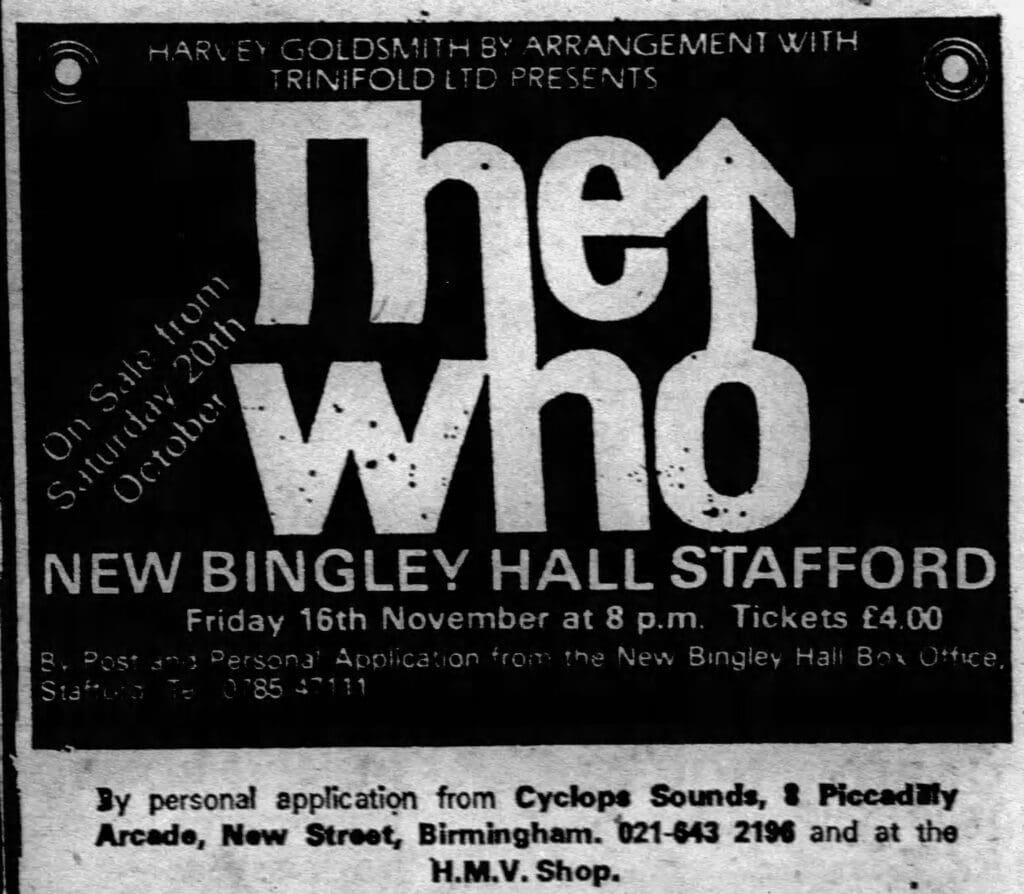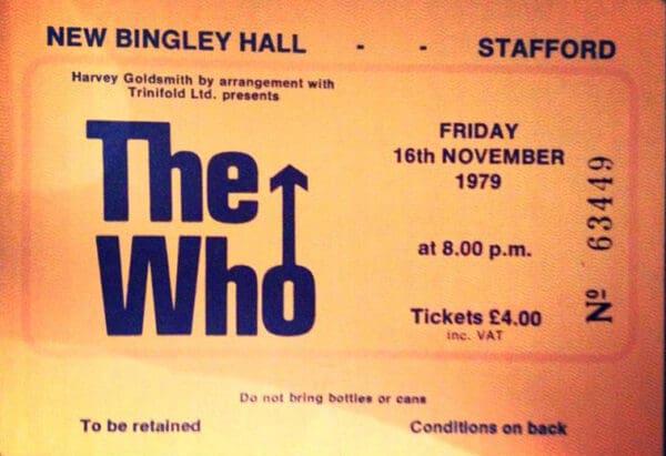 Friday, November 16th, 1979 The Who play New Bingley Hall in Stafford, Staffordshire « 1979-11-11 1979-11-17 » Photos Comments Leave a Reply Cancel replyYou must be logged in to post a comment. This site uses Akismet to reduce spam. Learn how your comment data is processed. Map Venue New Bingley Hall at the Staffordshire County Showground, Stafford I was there Latitude: 52.824668 Longitude: -2.065064 For more information on The Who’s history and concerts visit our friends www.thewhothismonth.com www.thewholive.com