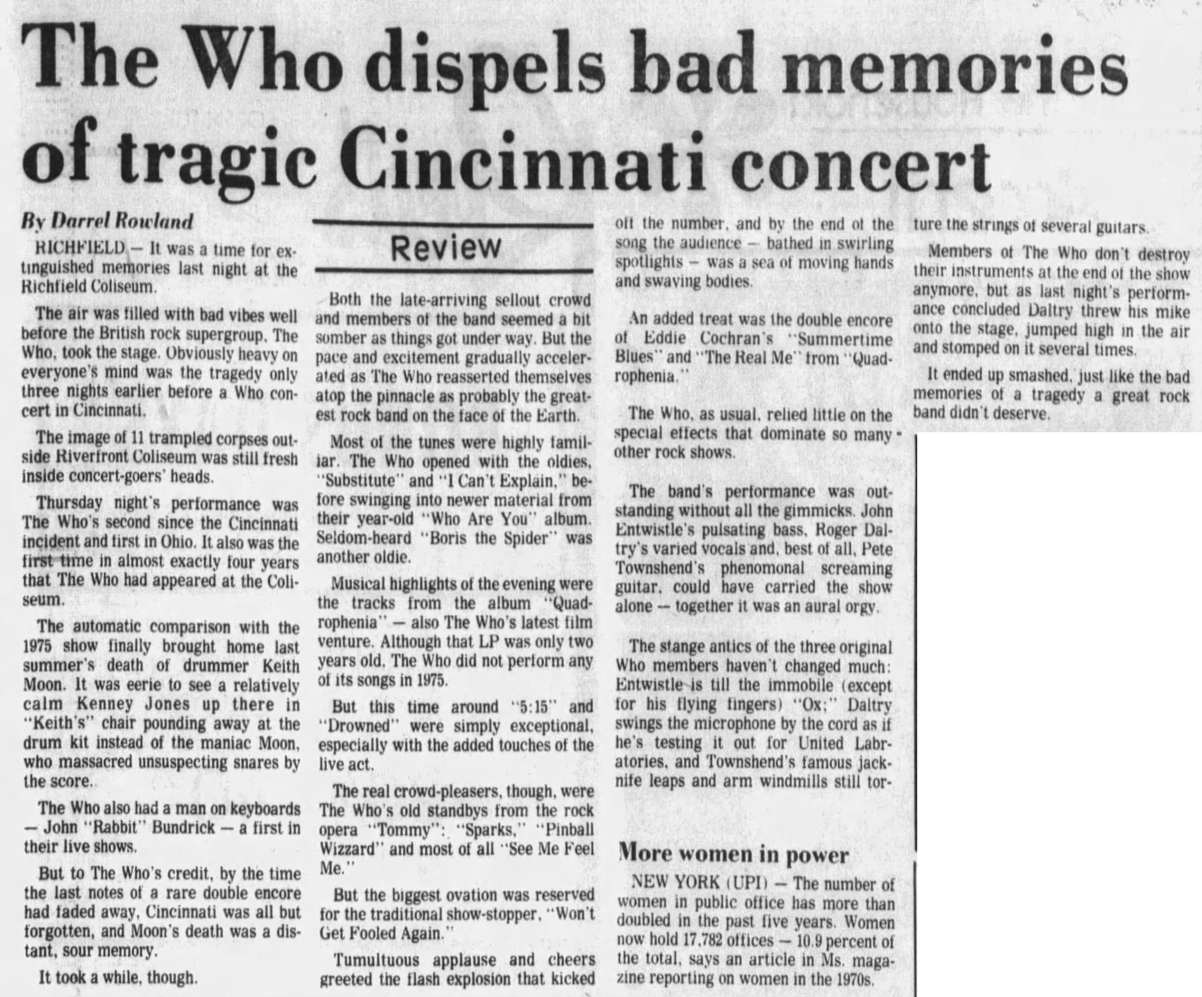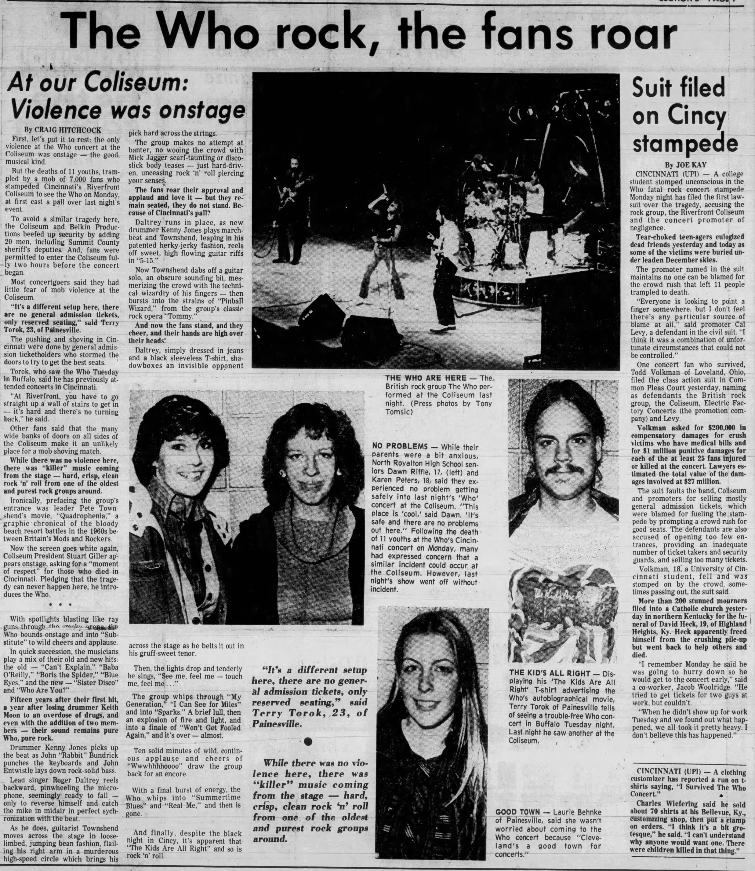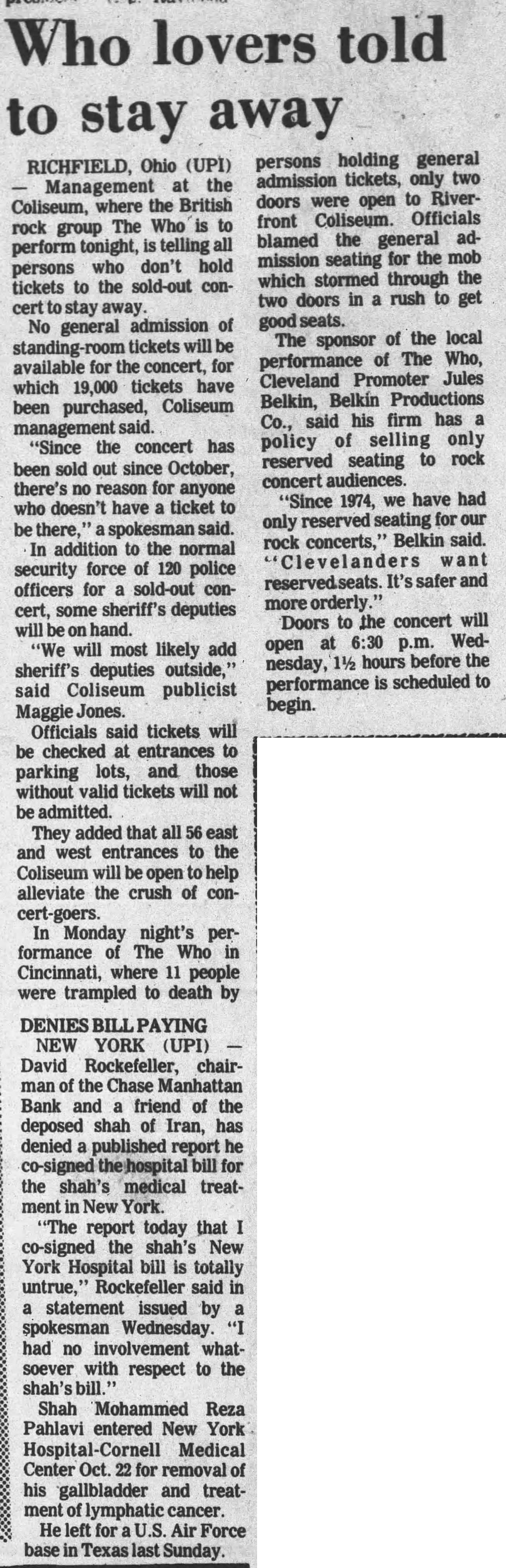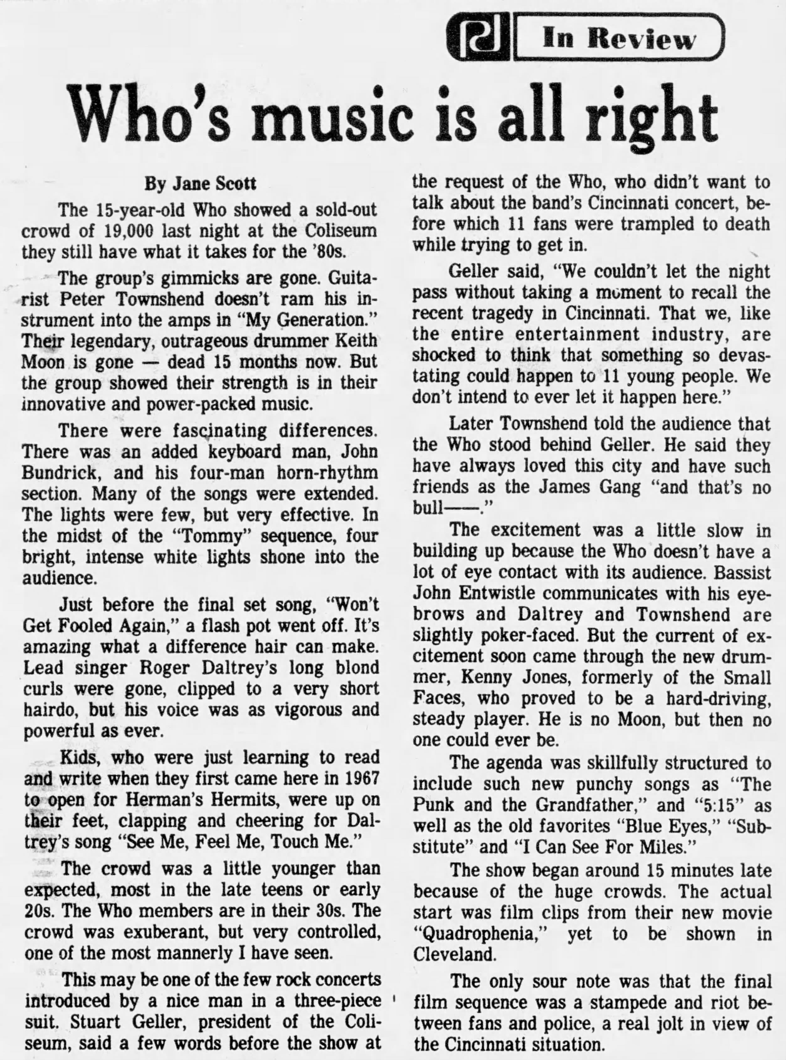 The Who perform at the Richfield, Ohio Coliseum. The Christian Science Monitorreports that Boston city officials have decided to allow The Who's concert of the 16th to take place. For the rest of the tour, whether The Who would be allowed to play becomes a matter of each city government's concern. Ultimately only the show in Providence, Rhode Island is canceled after the mayor says that by two shows into their tour, The Who have killed an average of 5.5 fans per show.