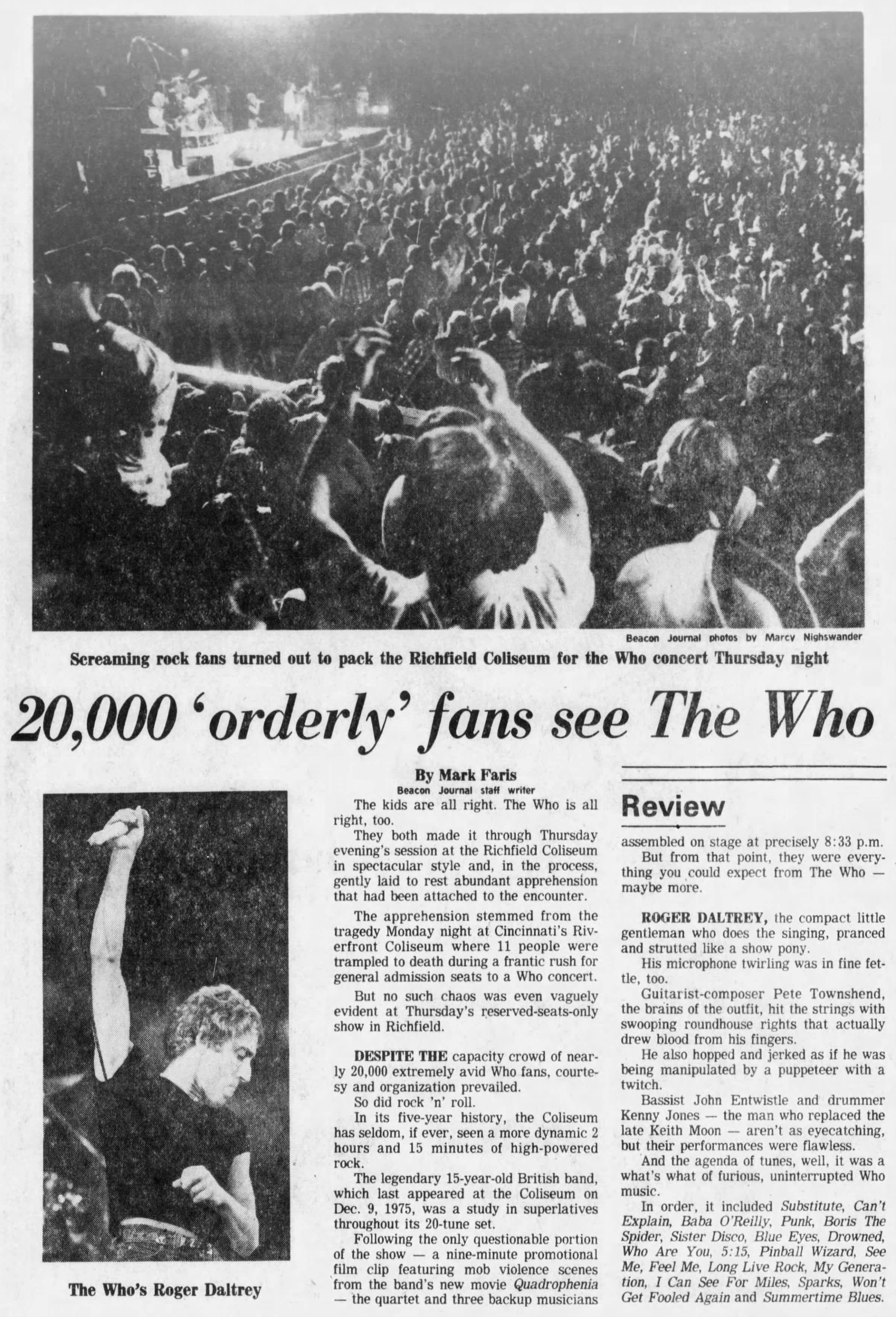 The Who perform at the Richfield, Ohio Coliseum. The Christian Science Monitorreports that Boston city officials have decided to allow The Who's concert of the 16th to take place. For the rest of the tour, whether The Who would be allowed to play becomes a matter of each city government's concern. Ultimately only the show in Providence, Rhode Island is canceled after the mayor says that by two shows into their tour, The Who have killed an average of 5.5 fans per show.