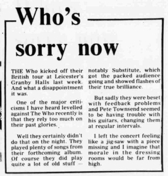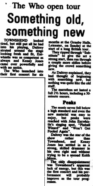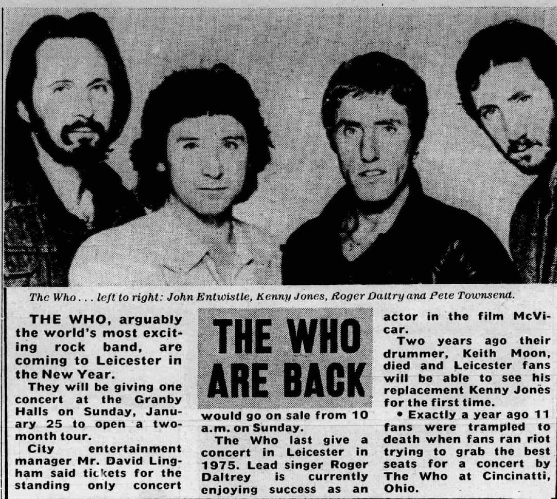 The Who open their 1981 U.K. tour at Granby Halls in Leicester. The opening act is The Q-Tips. The Who's set is lighter on their 60's songs and heavier on their 70's material than usual.