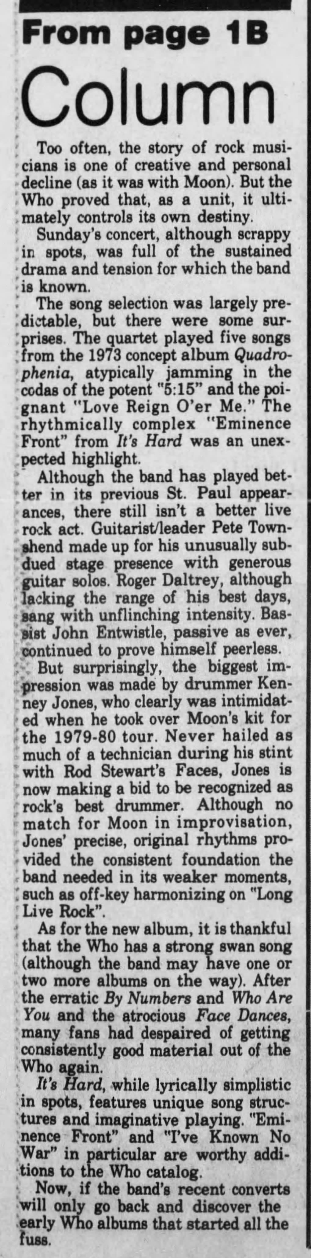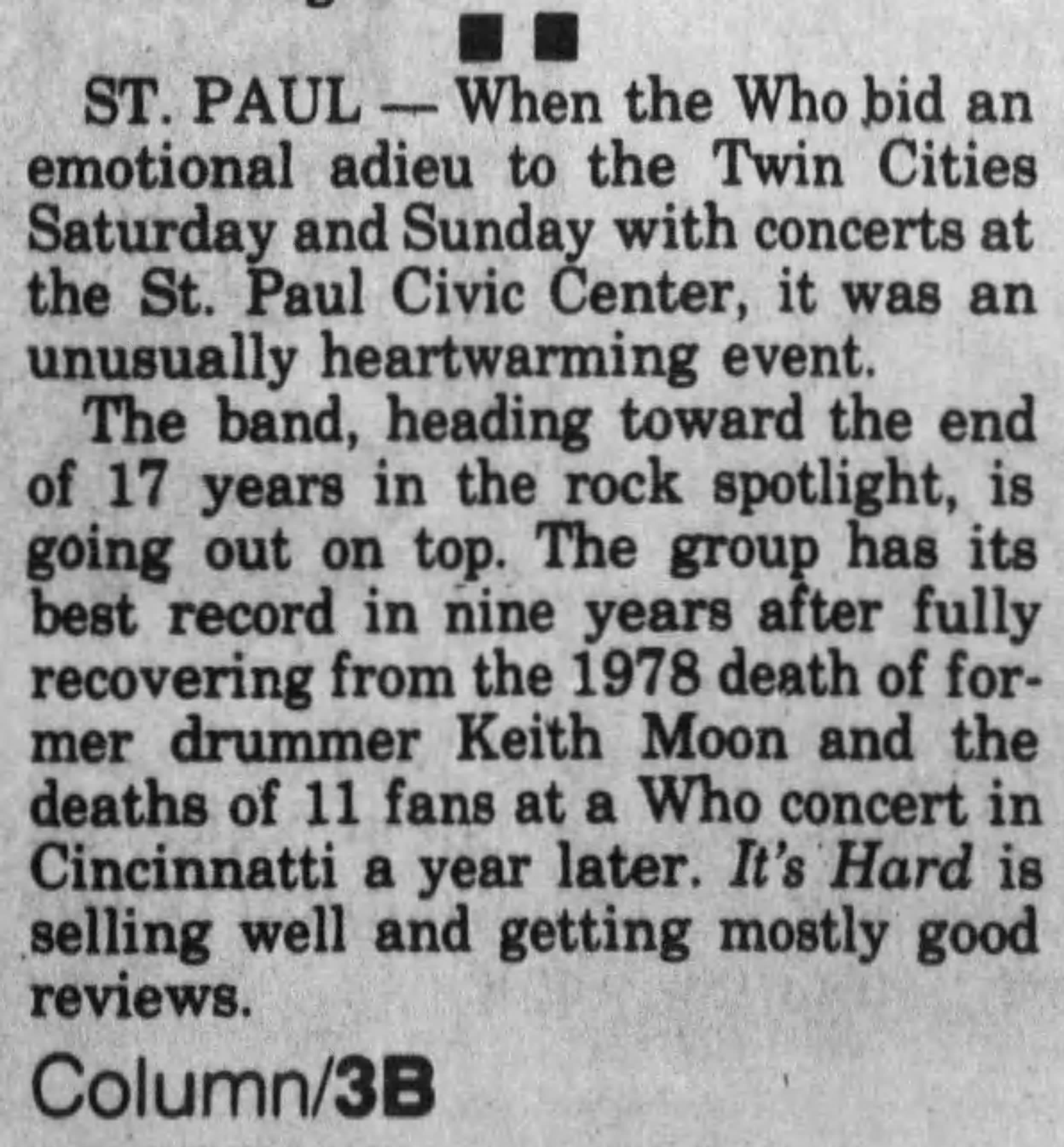 Sunday, October 3rd, 1982 The Who play the Saint Paul Civic Center in Saint Paul, Minnesota « 1982-10-02 1982-10-05 » Newspapers 1982-10-07-St_Cloud_Times_1 1982-10-07-St_Cloud_Times_2 https://ia802601.us.archive.org/13/items/Who1982-10-03CivicArenaSaintPaulMN/Who1982-10-03CivicArenaSaintPaulMN.mp3?cnt=0 Comments Leave a Reply Cancel replyYou must be logged in to post a comment. This site uses Akismet to reduce spam. Learn how your comment data is processed. Map Venue Saint Paul Civic Center, Saint Paul I was there Latitude: 44.944624 Longitude: -93.100940 For more information on The Who’s history and concerts visit our friends www.thewhothismonth.com www.thewholive.com