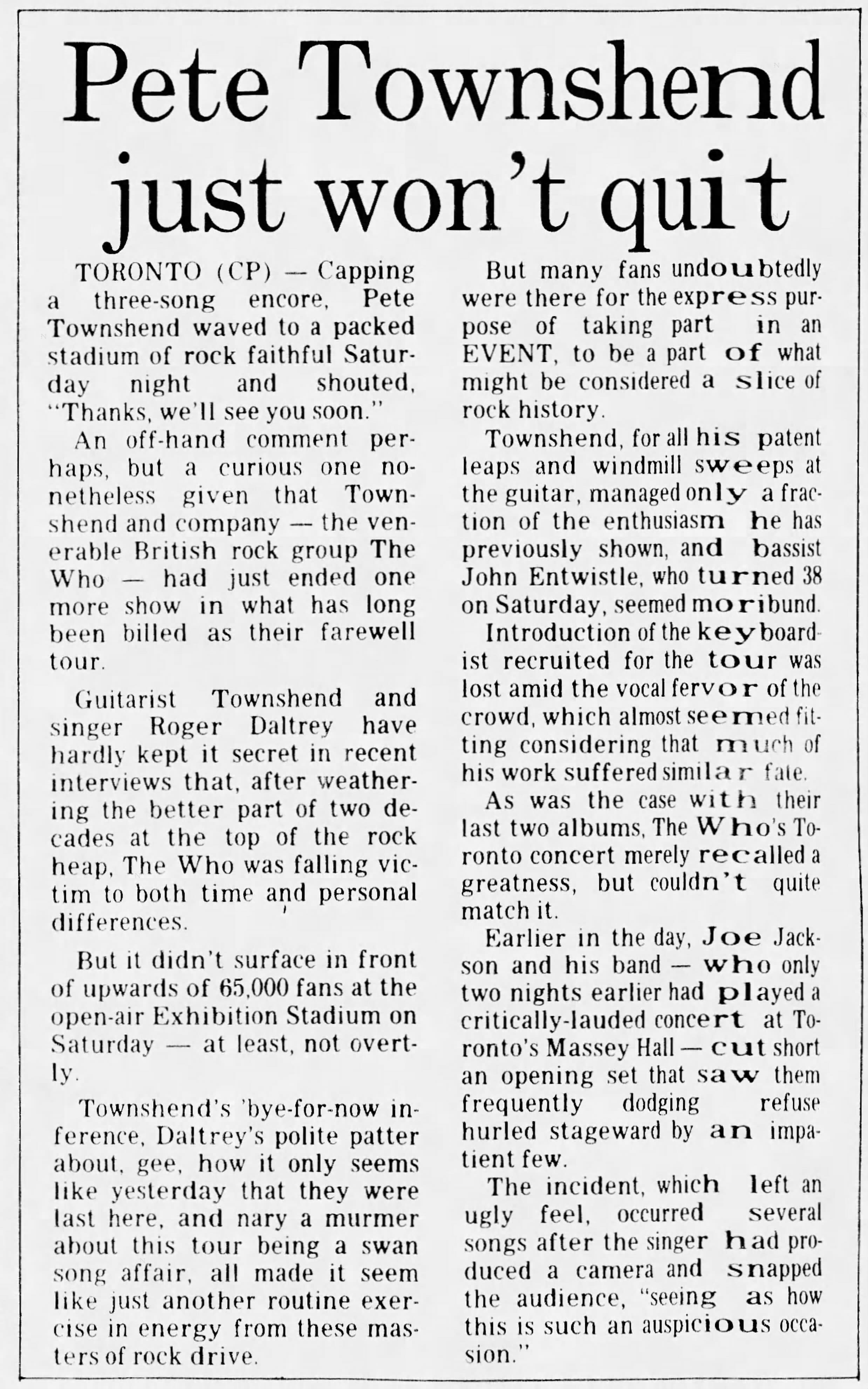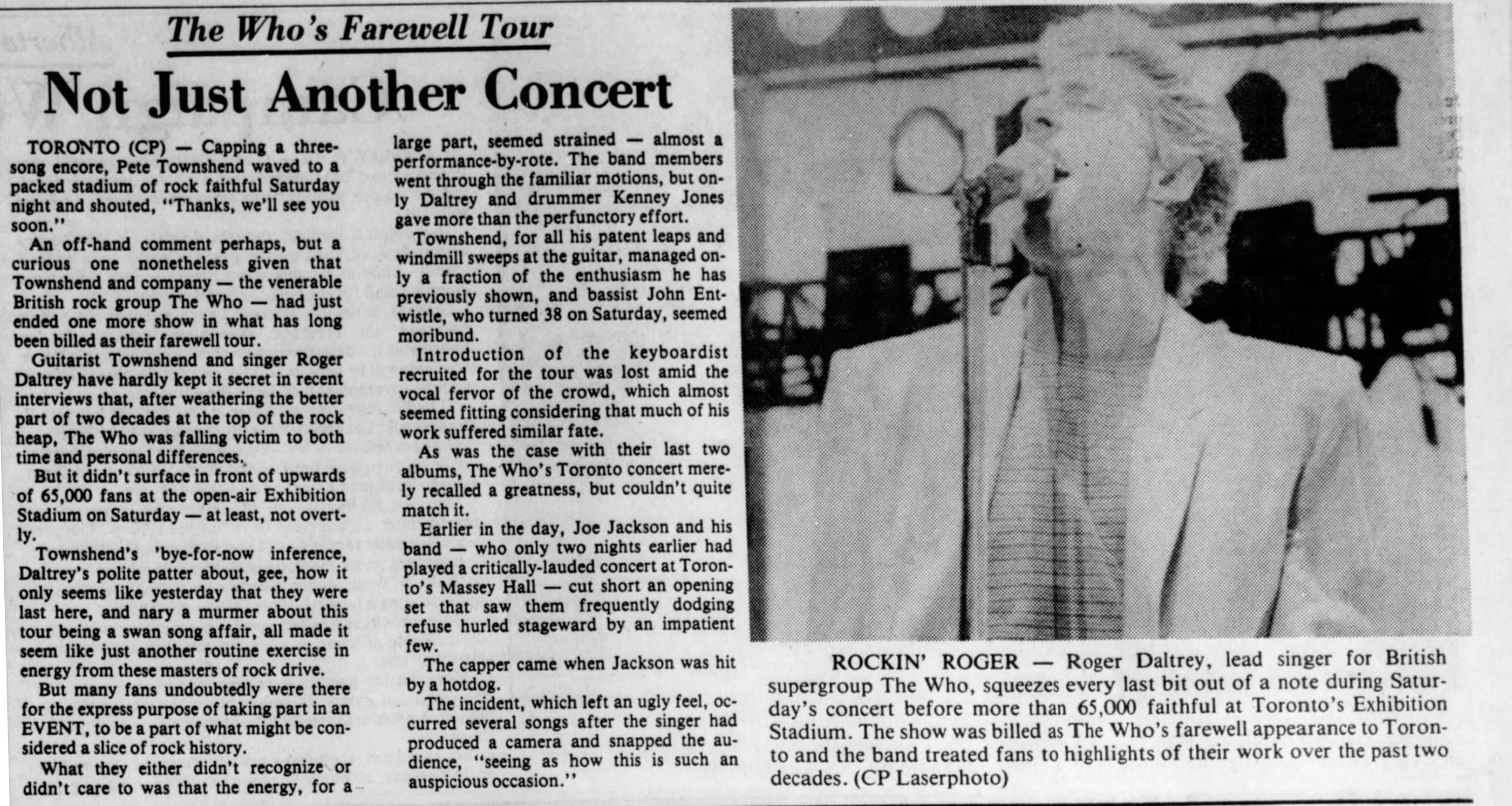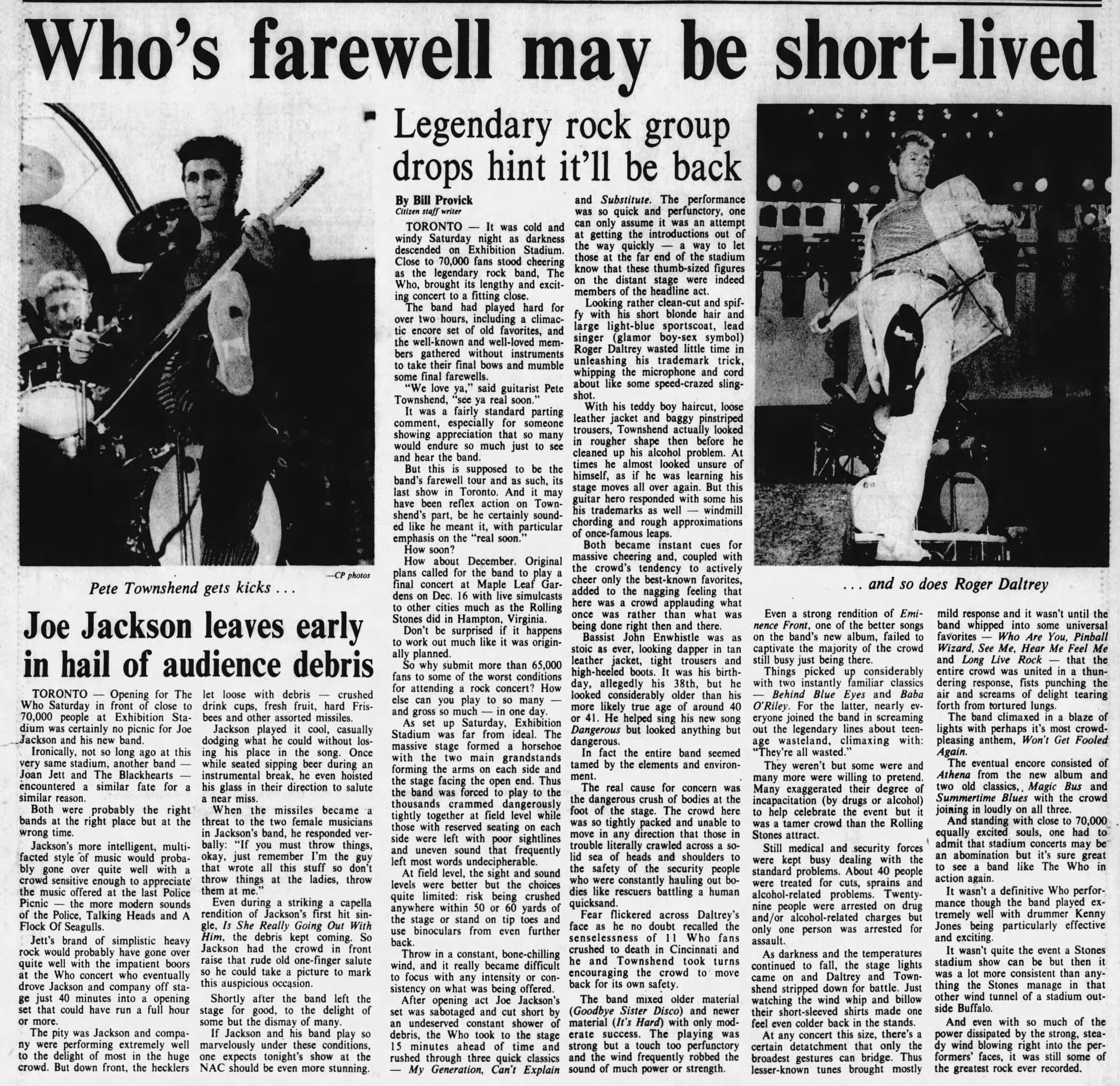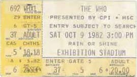Saturday, October 9th, 1982 The Who play CNE Stadium in Toronto, Joe Jackson opens. « 1982-10-07 1982-10-10 » Newspapers 1982-10-09-Red_Deer_Advocate 1982-10-09-The_Globe_and_Mail 1982-10-10-The_Toronto_Star 1982-10-11-The_Globe_and_Mail 1982-10-12-Red_Deer_Advocate 1982-10-12-Telegraph_Journal 1982-10-12-The_Gazette 1982-10-12-The_Hamilton_Spectator 1982-10-12-The_Ottawa_Citizen http://www.archive.org/serve/Who1982-10-09TorontoCanada/Who1982-10-09TorontoCanada.mp3 Comments Leave a Reply Cancel replyYou must be logged in to post a comment. This site uses Akismet to reduce spam. Learn how your comment data is processed. Map Venue Canadian National Exhibition Stadium, Toronto I was there Latitude: 43.632096 Longitude: -79.418250 For more information on The Who’s history and concerts visit our friends www.thewhothismonth.com www.thewholive.com