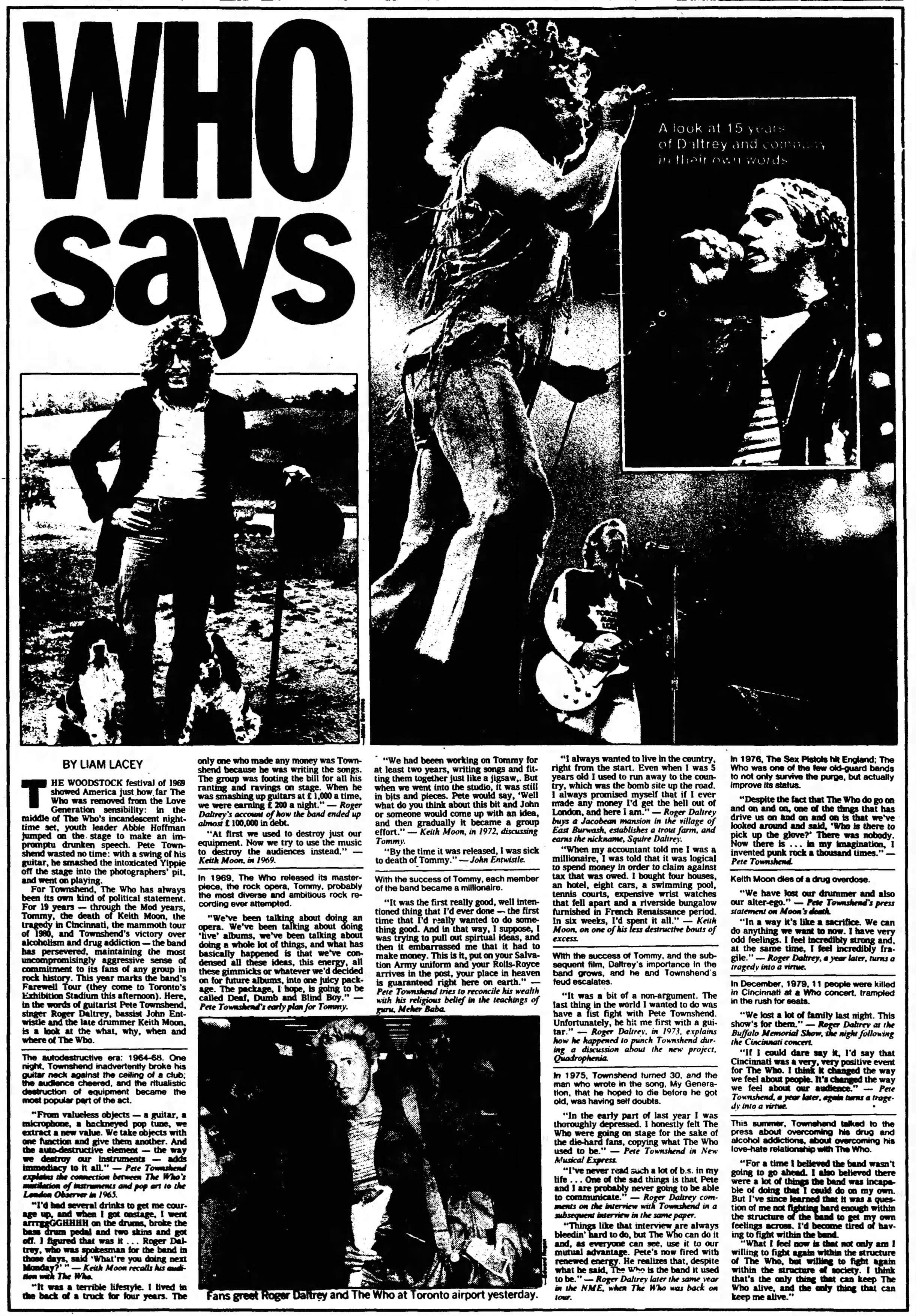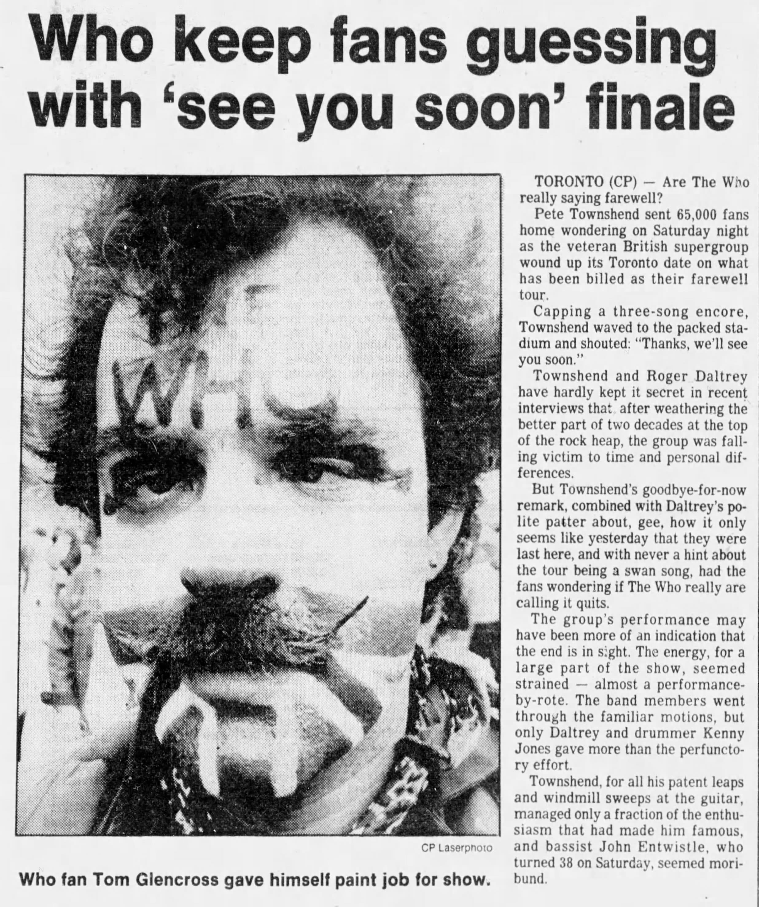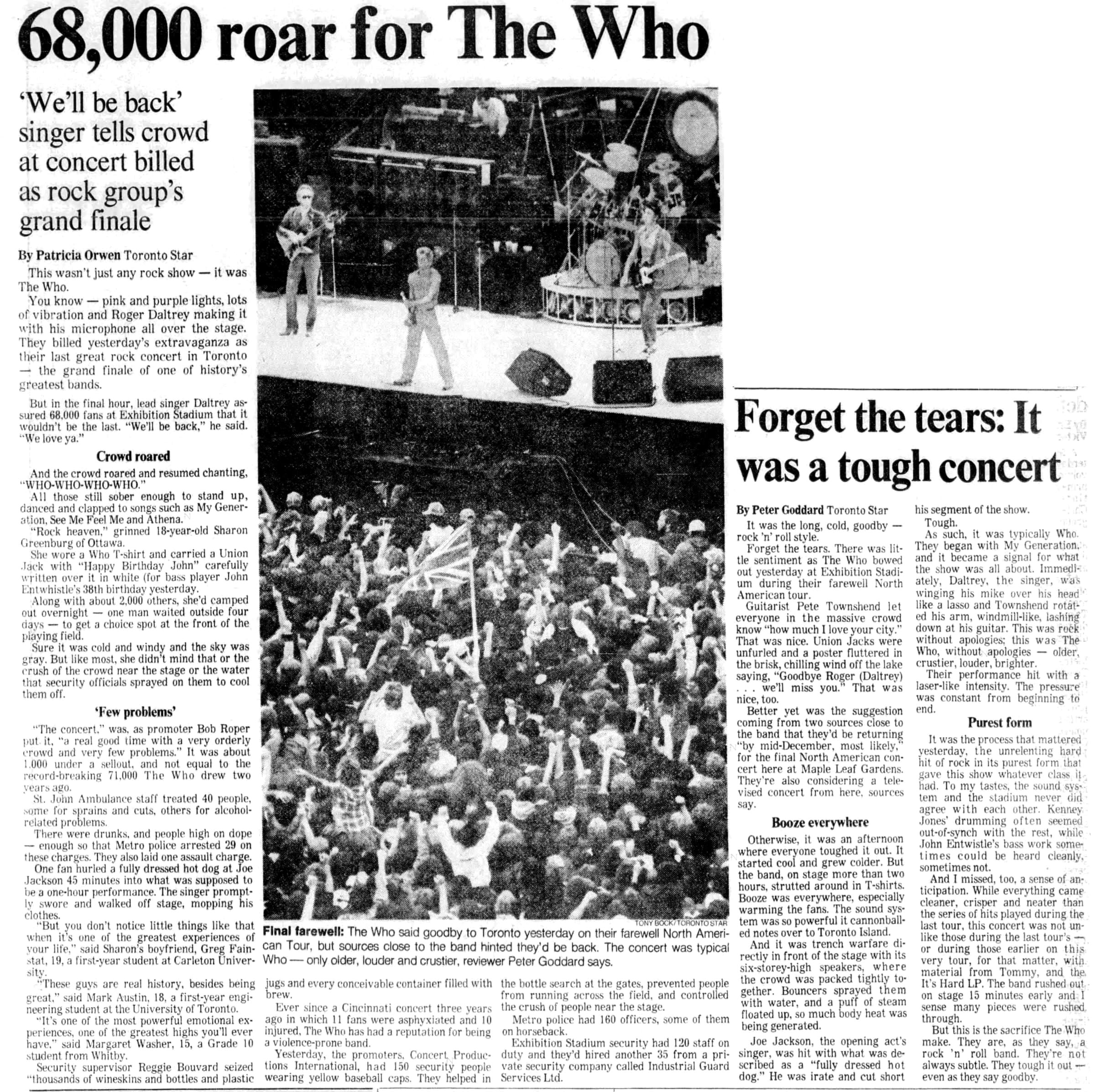 Saturday, October 9th, 1982 The Who play CNE Stadium in Toronto, Joe Jackson opens. « 1982-10-07 1982-10-10 » Newspapers 1982-10-09-Red_Deer_Advocate 1982-10-09-The_Globe_and_Mail 1982-10-10-The_Toronto_Star 1982-10-11-The_Globe_and_Mail 1982-10-12-Red_Deer_Advocate 1982-10-12-Telegraph_Journal 1982-10-12-The_Gazette 1982-10-12-The_Hamilton_Spectator 1982-10-12-The_Ottawa_Citizen http://www.archive.org/serve/Who1982-10-09TorontoCanada/Who1982-10-09TorontoCanada.mp3 Comments Leave a Reply Cancel replyYou must be logged in to post a comment. This site uses Akismet to reduce spam. Learn how your comment data is processed. Map Venue Canadian National Exhibition Stadium, Toronto I was there Latitude: 43.632096 Longitude: -79.418250 For more information on The Who’s history and concerts visit our friends www.thewhothismonth.com www.thewholive.com