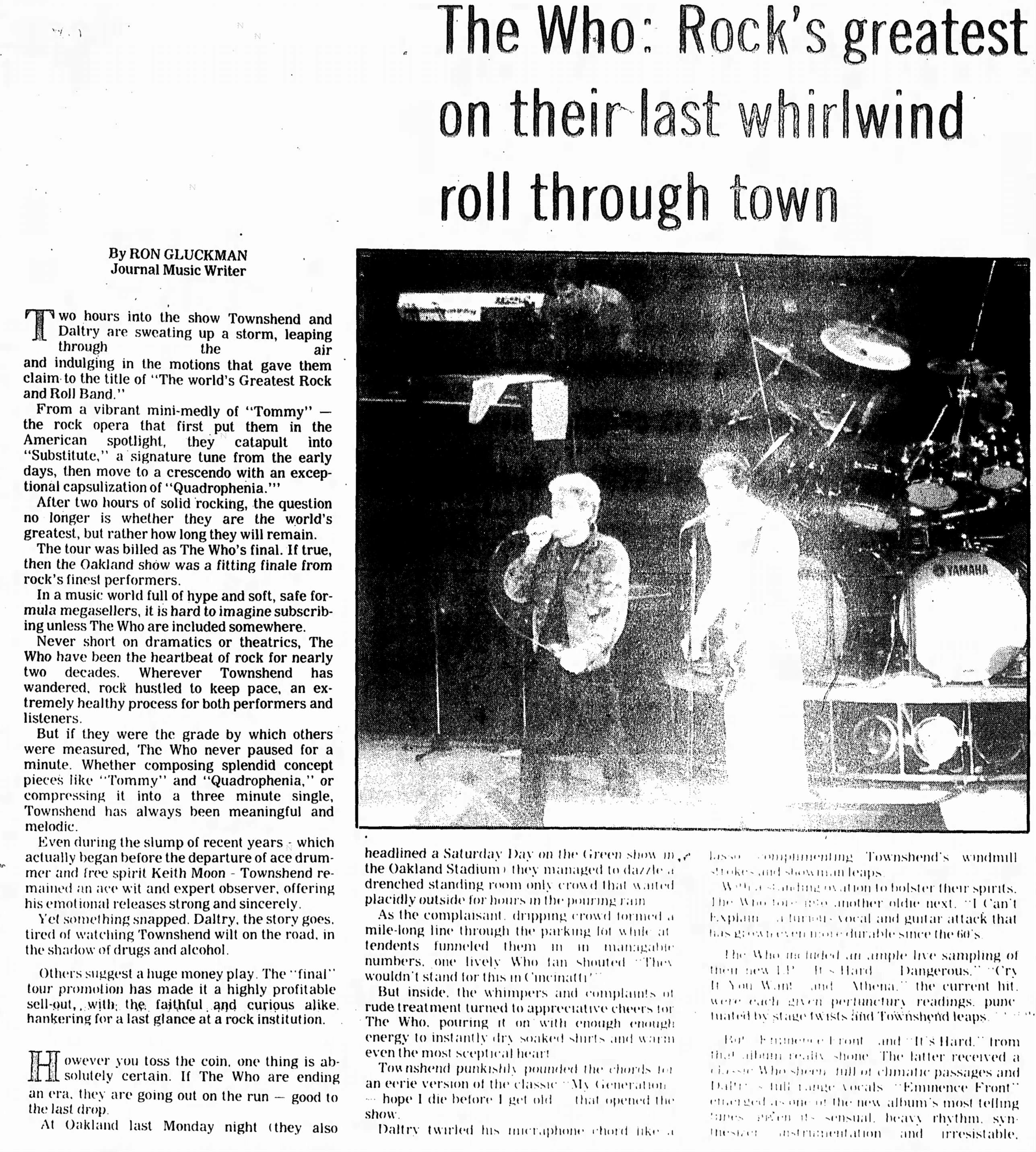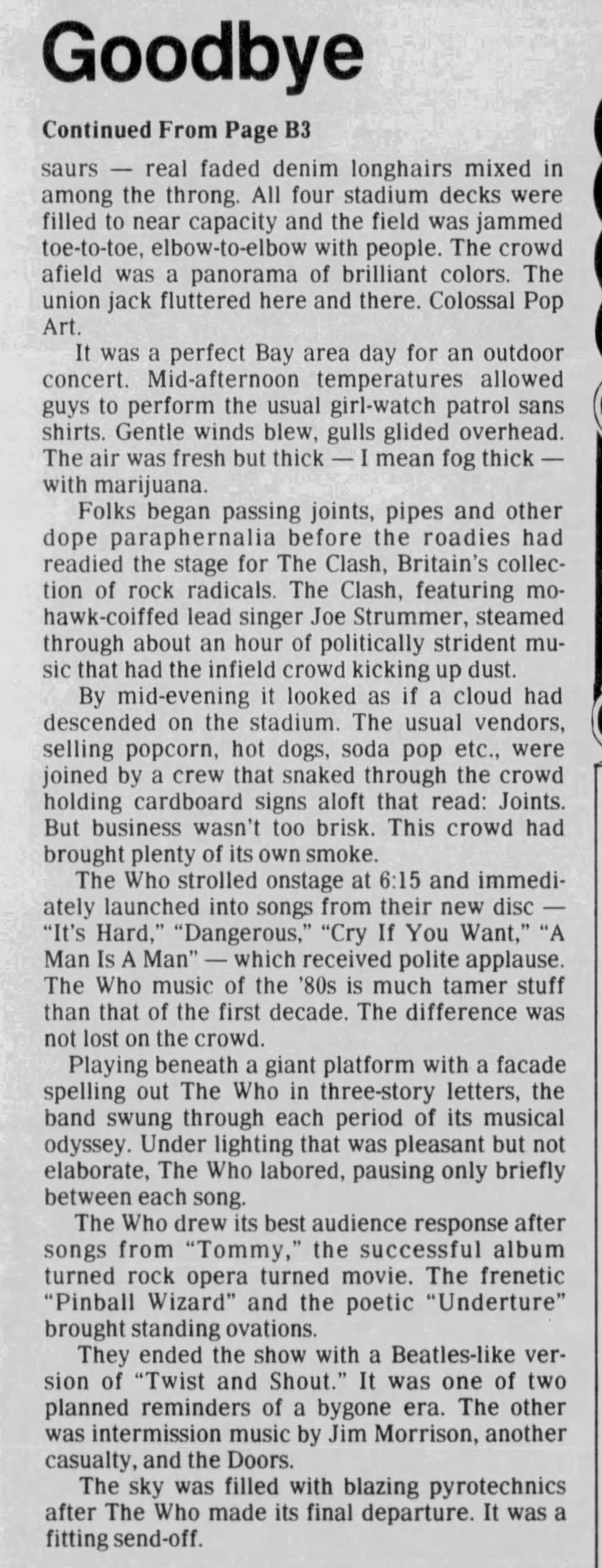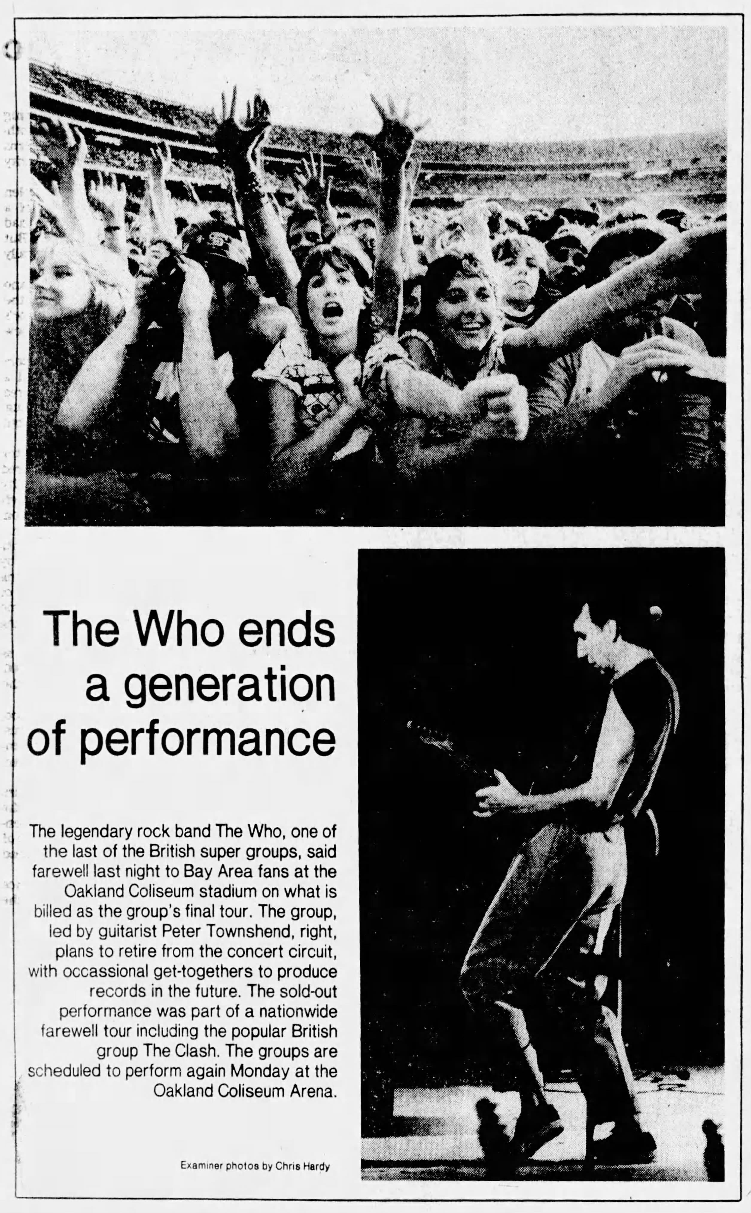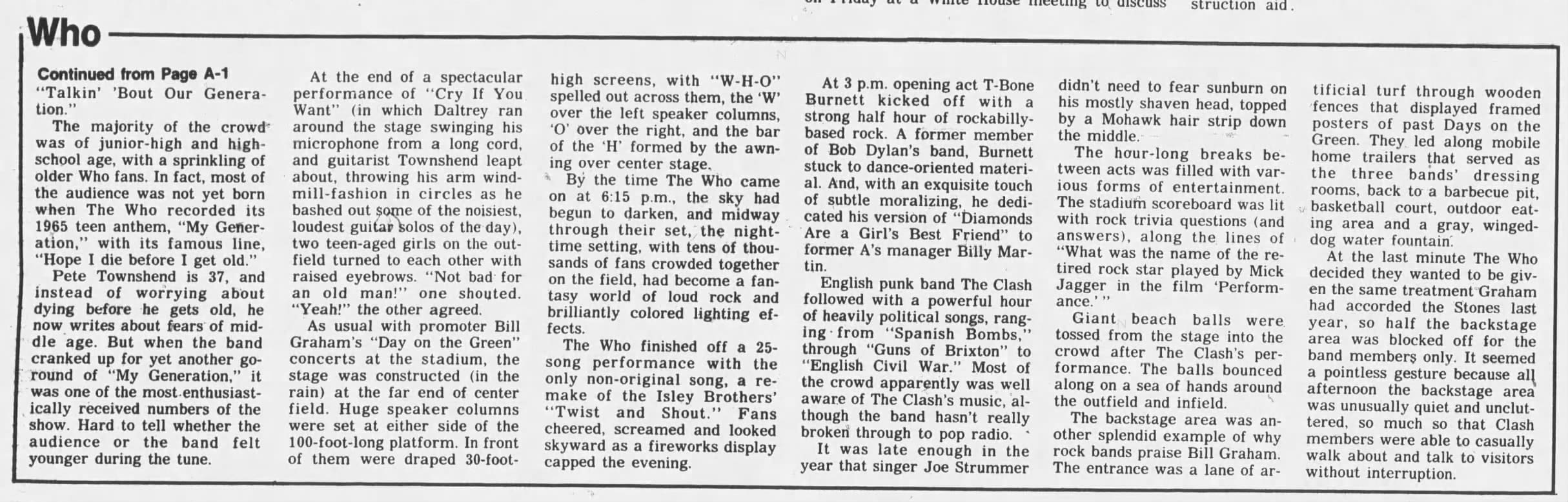 The Who play the Oakland Coliseum in Oakland, California. T-Bone Burnett and The Clash open