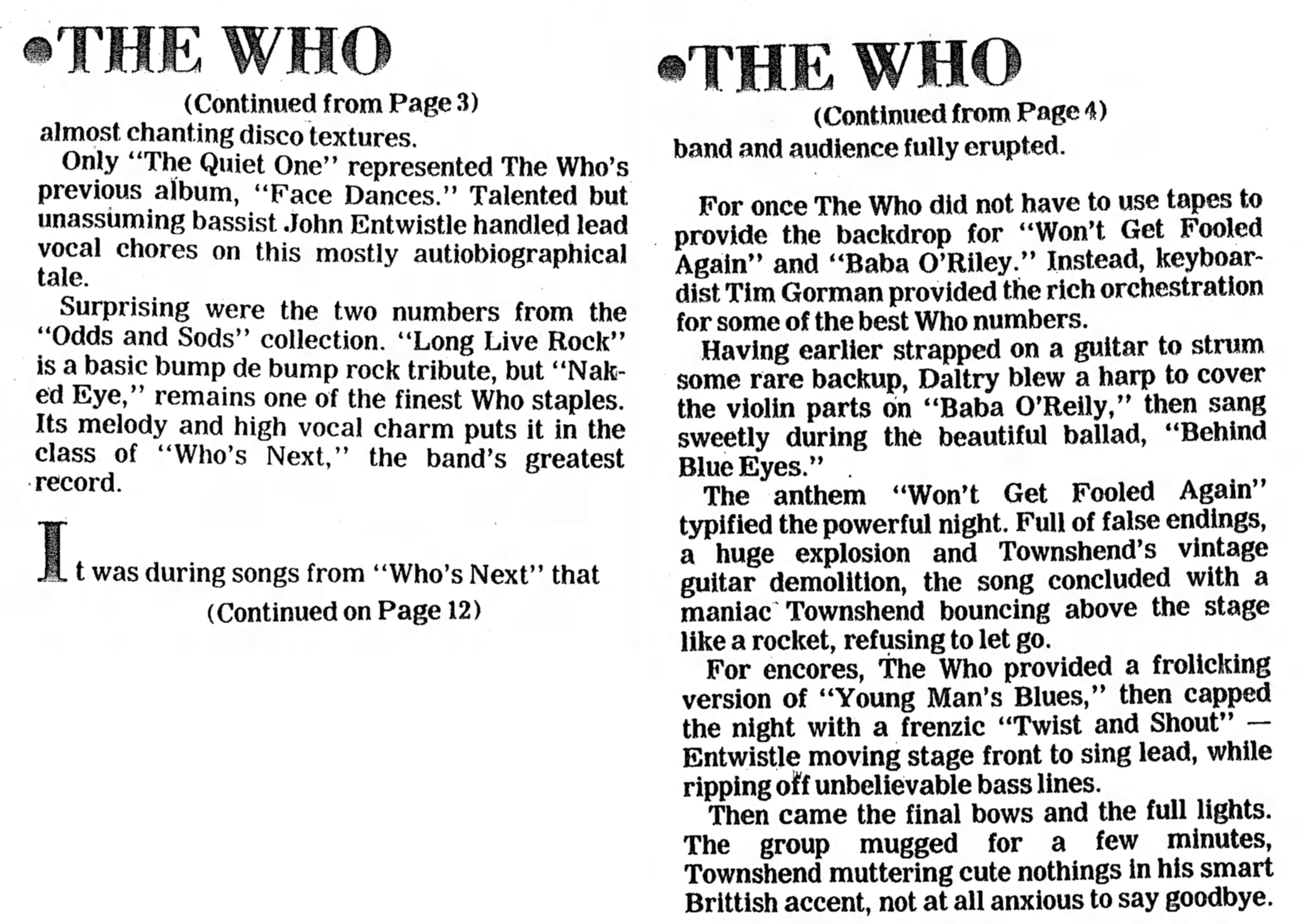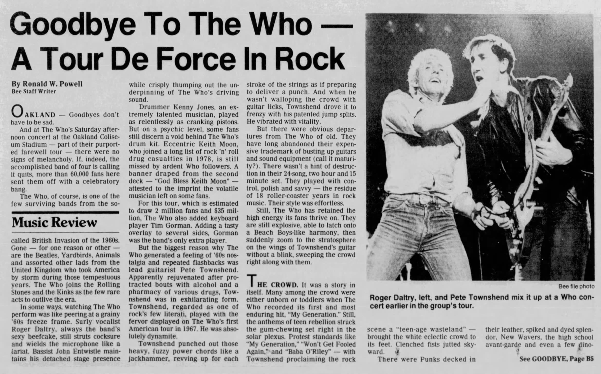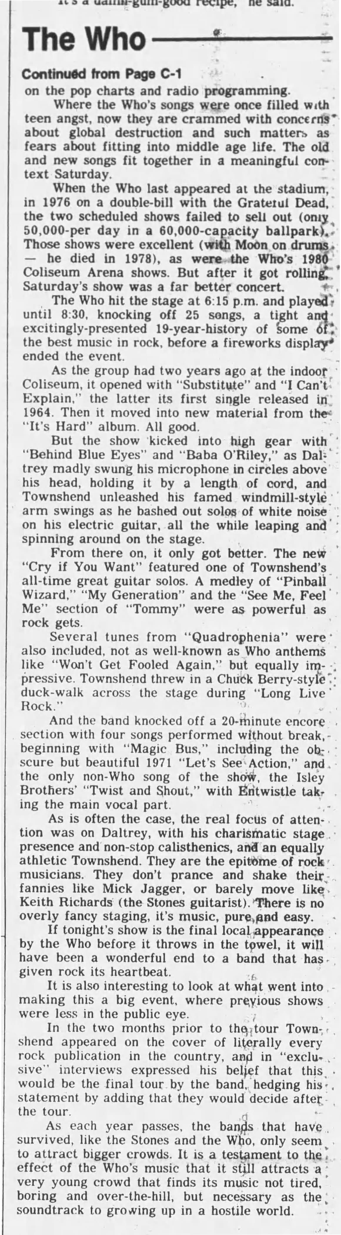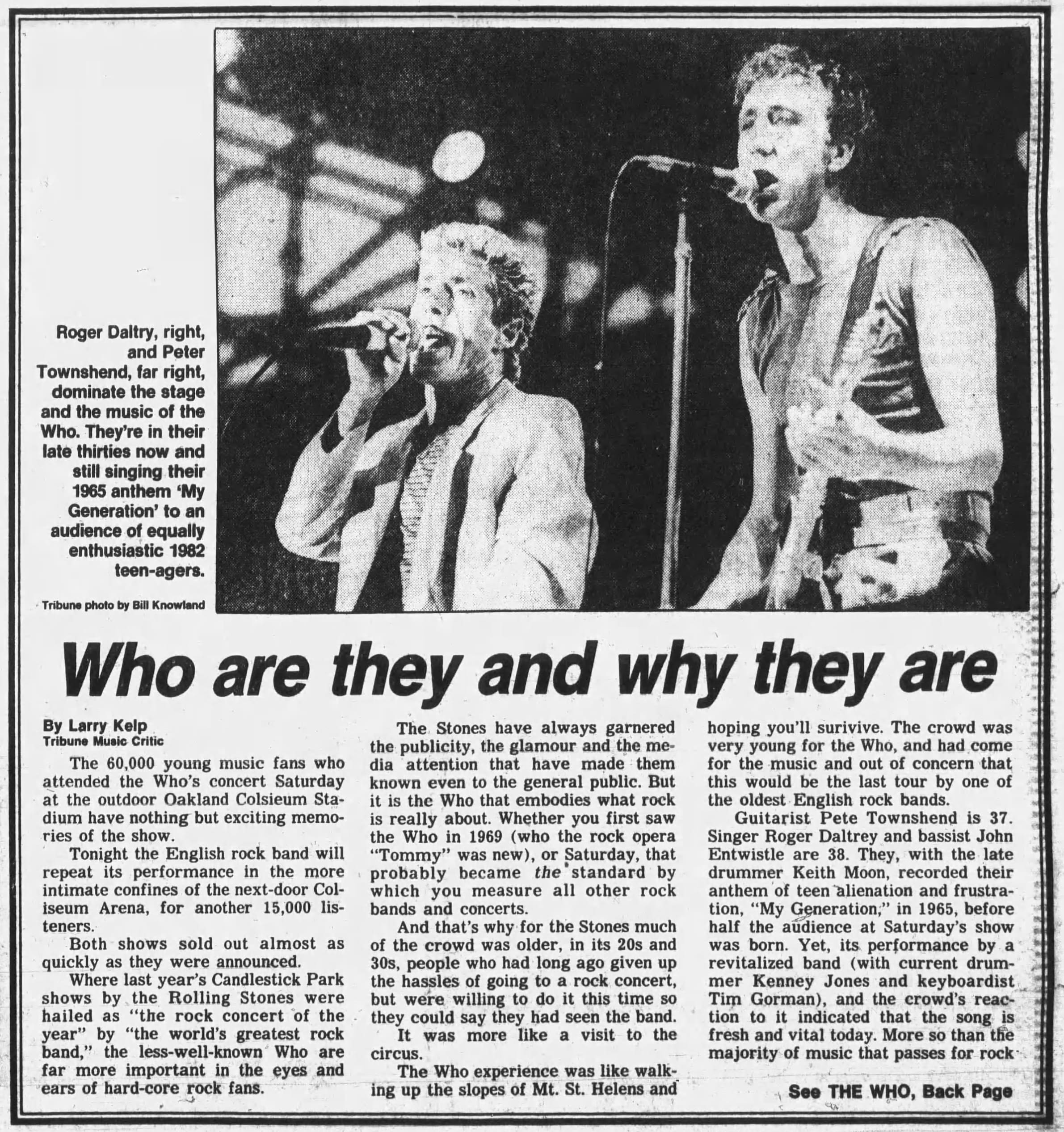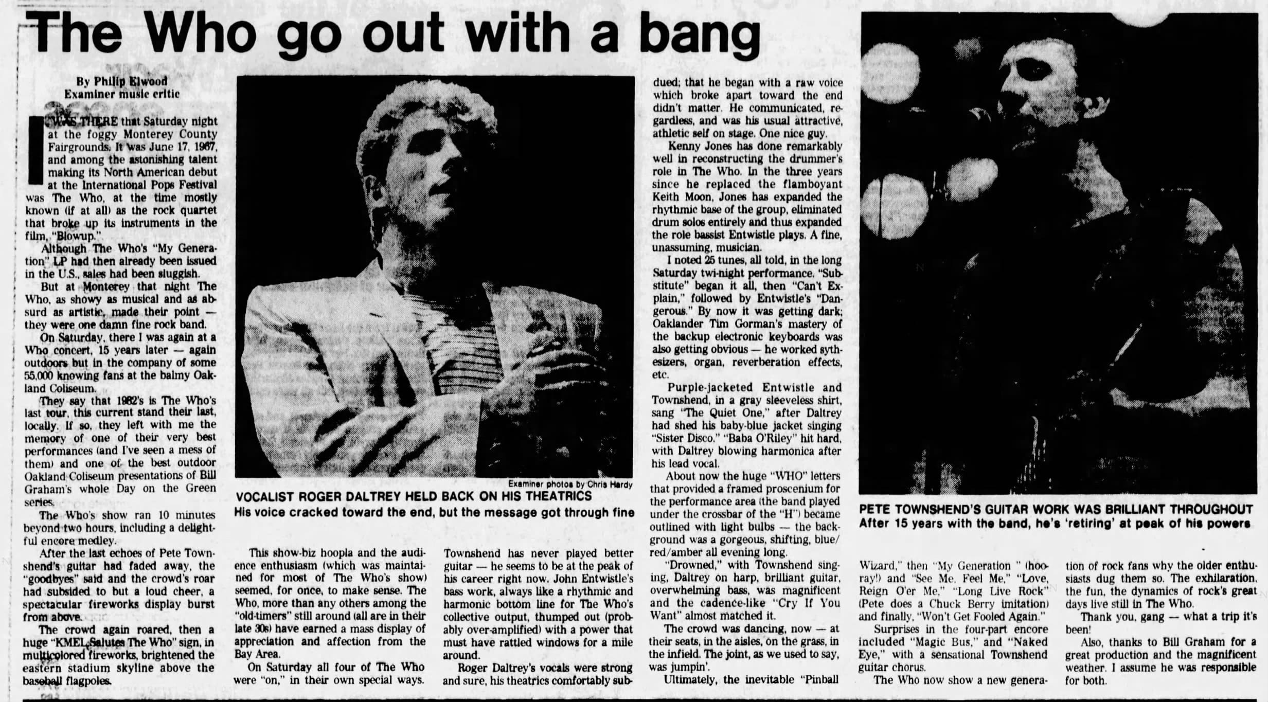 The Who play the Oakland Coliseum in Oakland, California. T-Bone Burnett and The Clash open