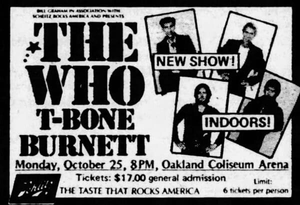 The Who play the Oakland-Alameda County Coliseum Arena in Oakland, California. T-Bone Burnett and The Clash open. The Who drop “Athena” and “A Man Is A Man” from the song lineup. Bobby Pridden receives an “Employee Of The Month” award during the show.