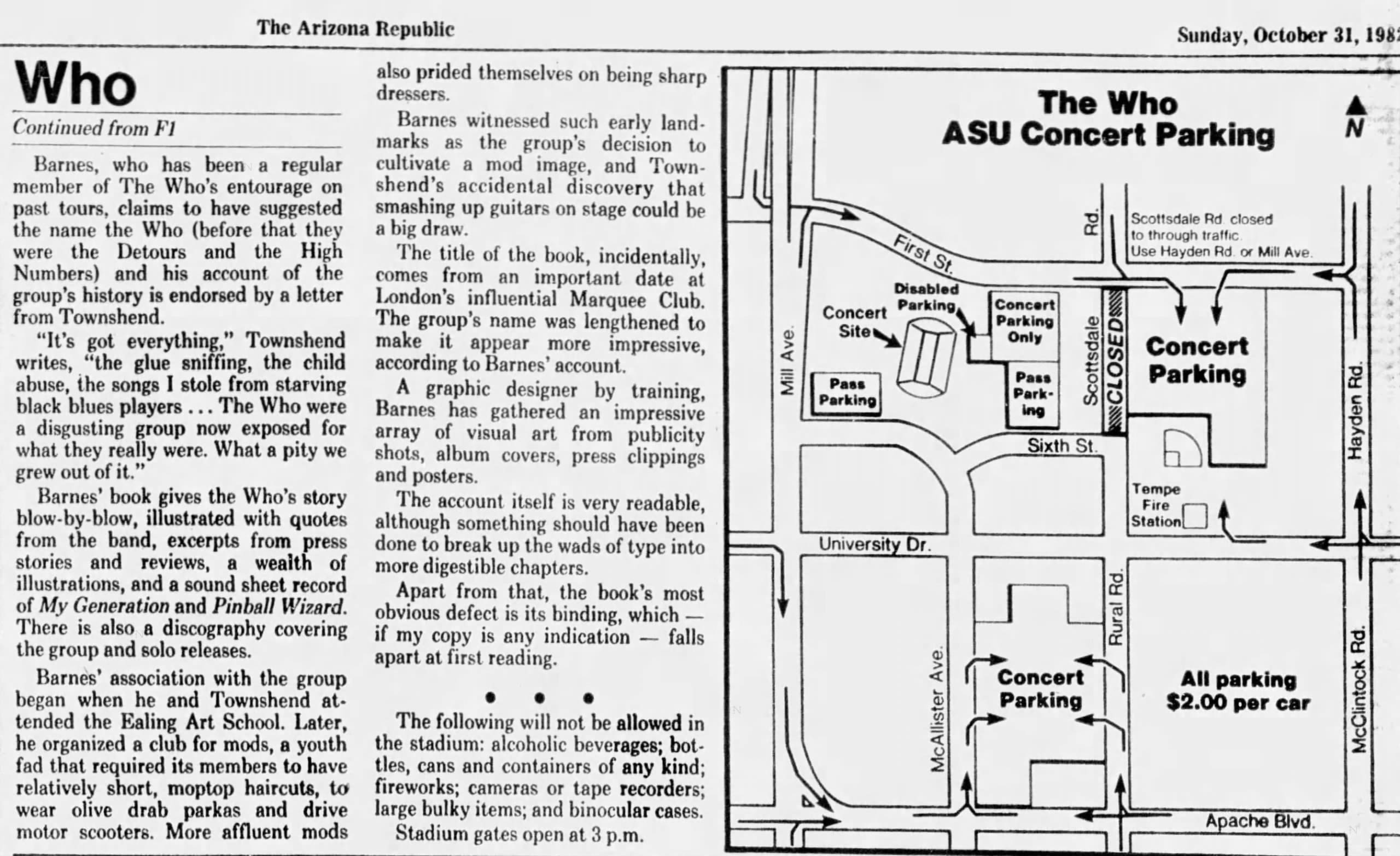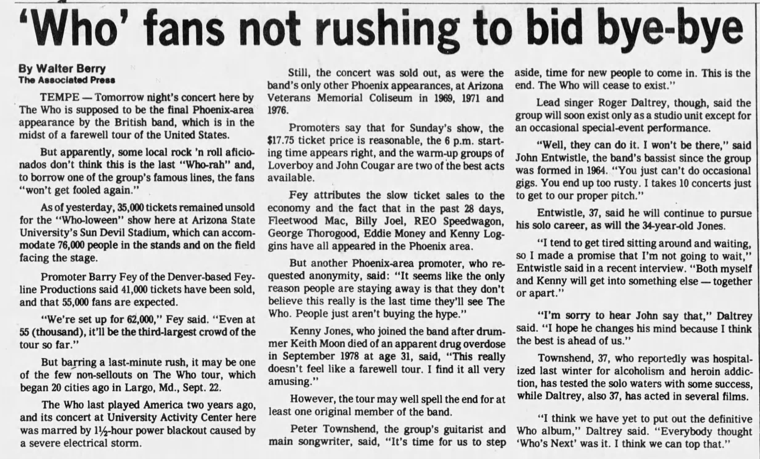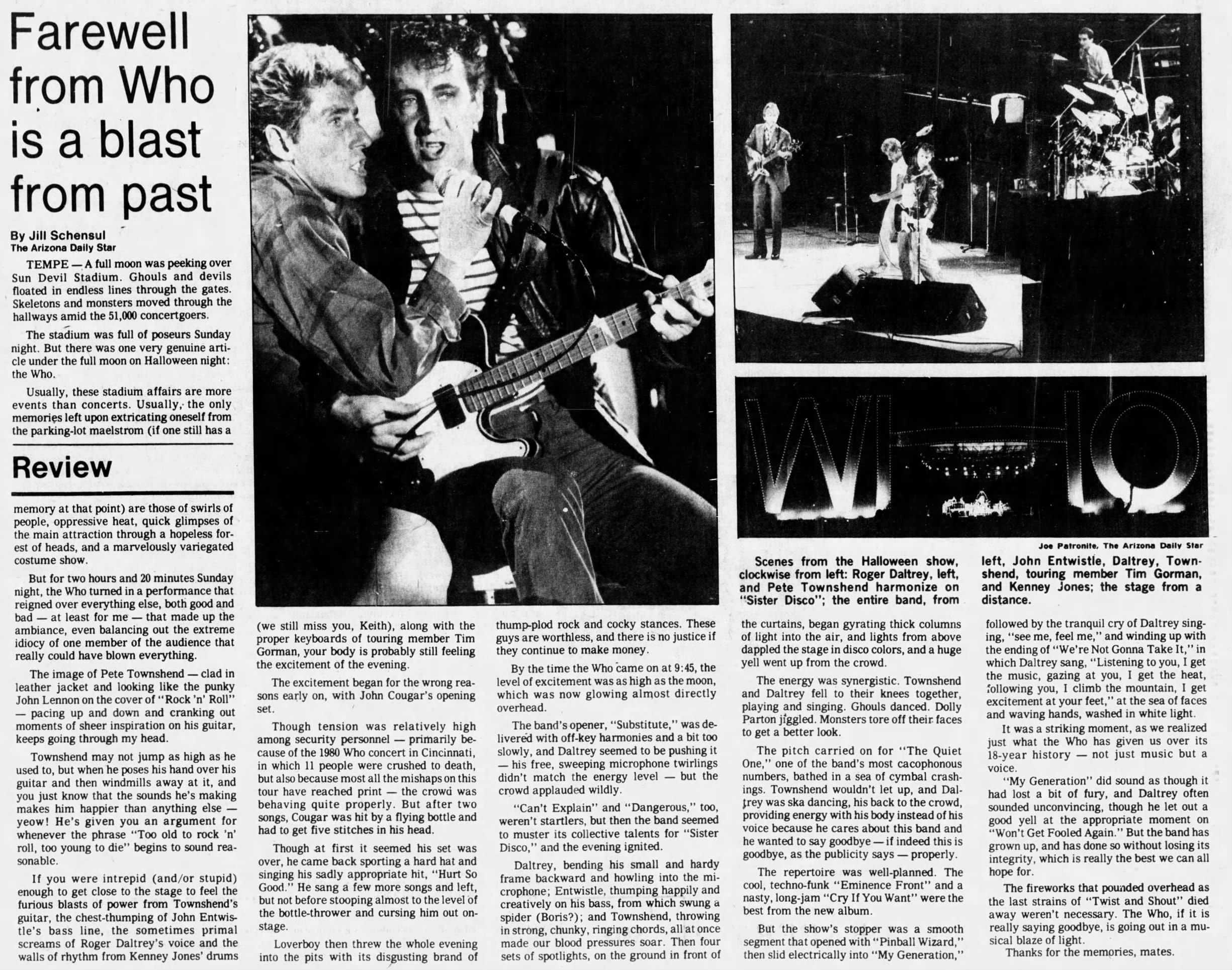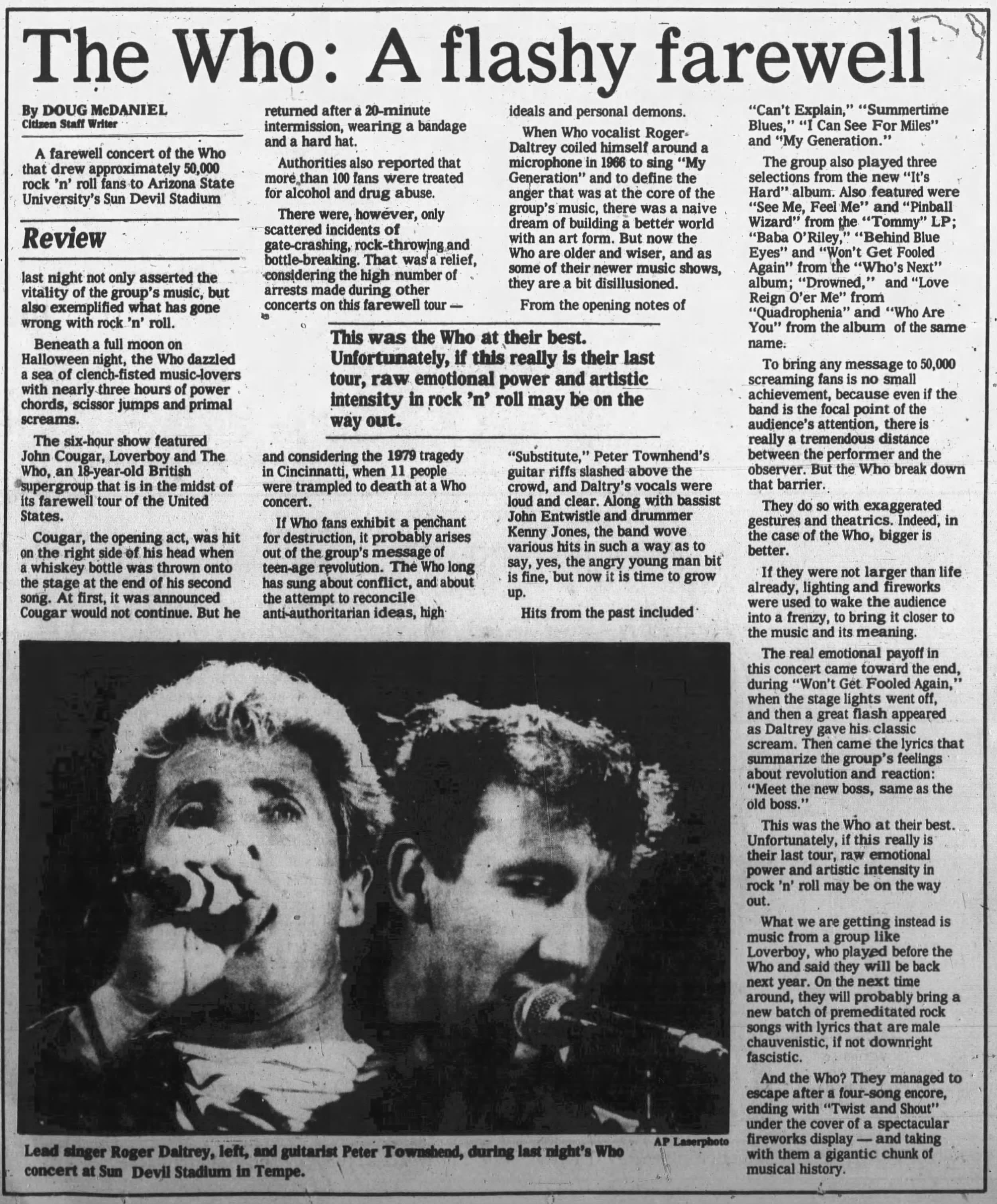 The Who play at the Sun Devil Stadium in Tempe, Arizona. John Cougar and Loverboy open.
