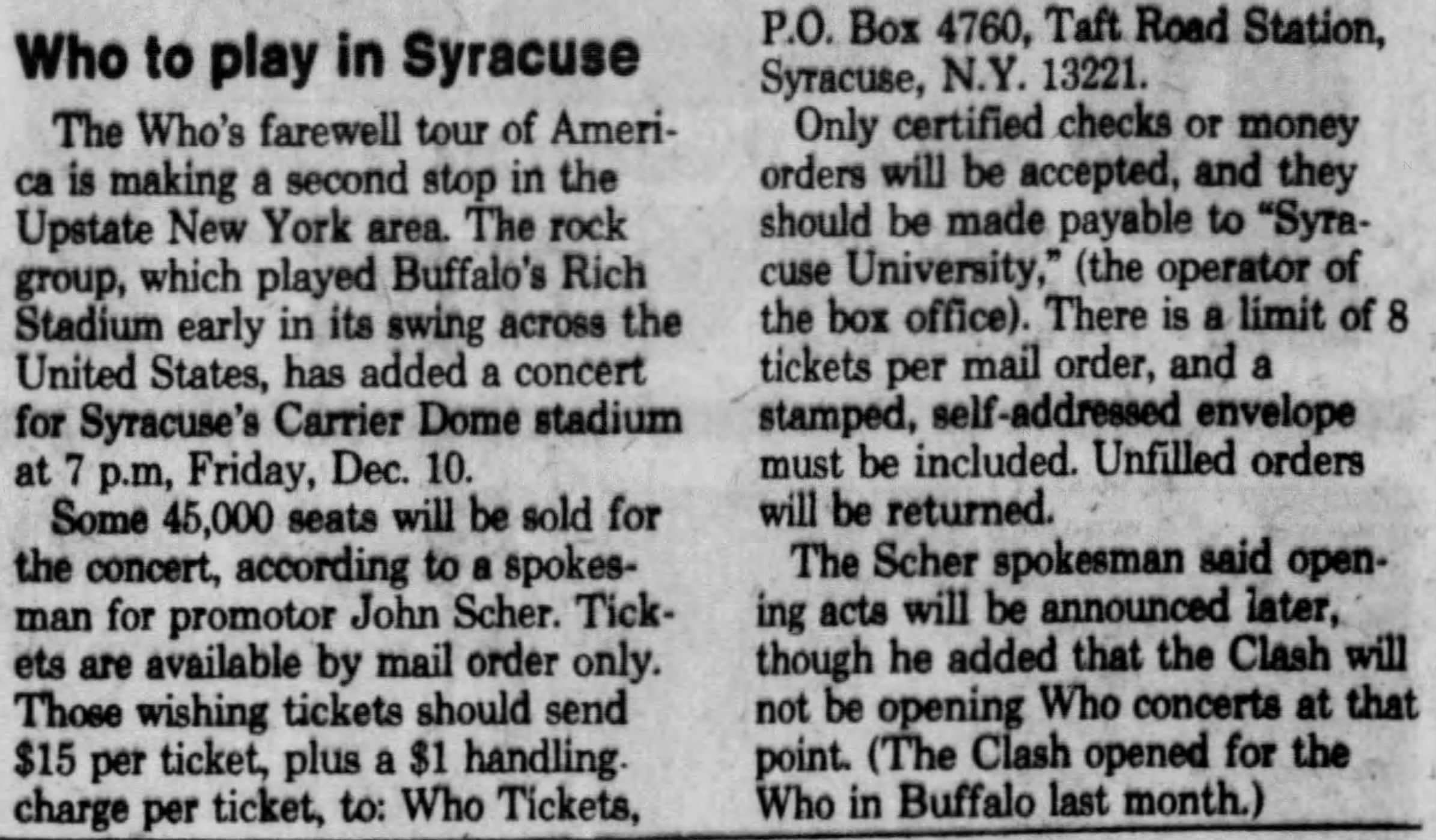 The Who play the Carrier Dome in Syracuse, New York with opening act David Johansen.