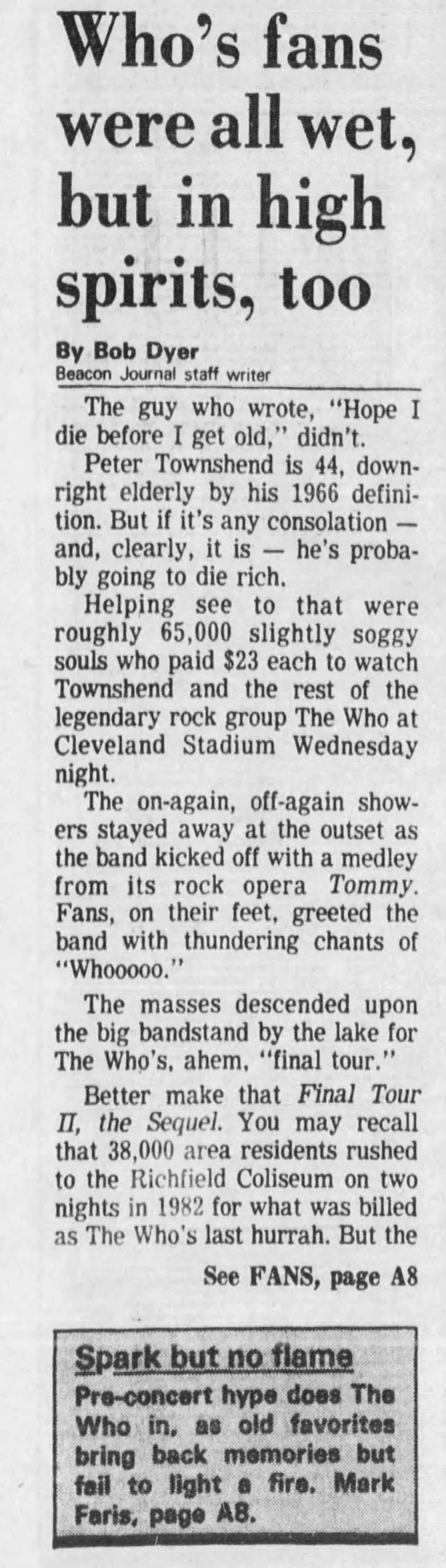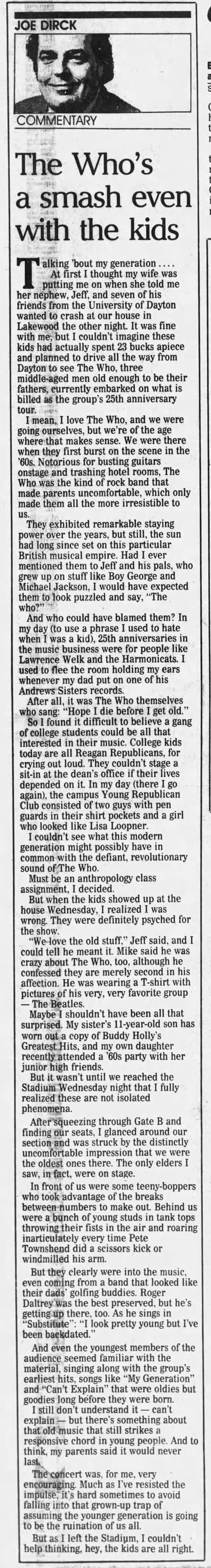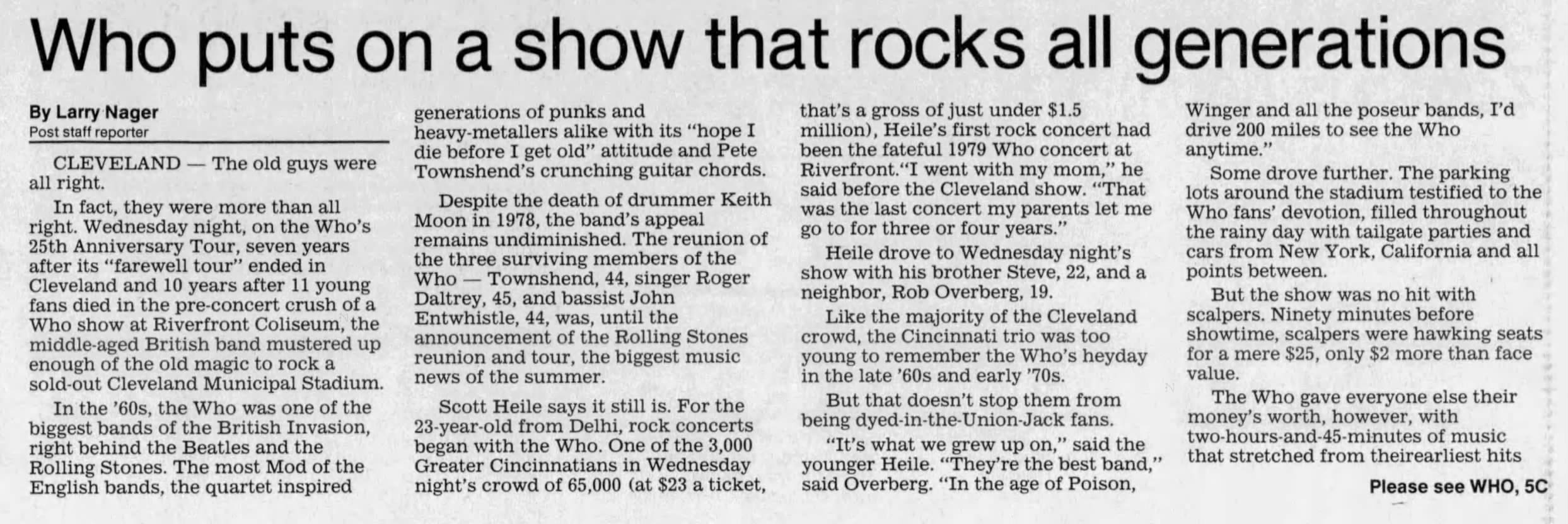 Wednesday, July 19th, 1989 The Who play Cleveland Stadium in Cleveland, Ohio « 1989-07-18 1989-07-21 » WhoTube Newspapers 1989-07-20-Telegraph_Forum 1989-07-20-The_Akron_Beacon_Journal_1 1989-07-20-The_Akron_Beacon_Journal_2 1989-07-20-The_Cincinnati_Post_1 1989-07-20-The_Cincinnati_Post_2 1989-07-20-The_Plain_Dealer_1 1989-07-20-The_Plain_Dealer_2 1989-07-20-The_Plain_Dealer_3 1997-07-21-The_Plain_Dealer http://www.archive.org/serve/Who1989-07-19MunicipalStadiumClevelandOH/Who1989-07-19MunicipalStadiumClevelandOH.mp3 Comments Leave a Reply Cancel replyYou must be logged in to post a comment. This site uses Akismet to reduce spam. Learn how your comment data is processed. Map Venue Cleveland Stadium, Cleveland I was there Latitude: 41.505806 Longitude: -81.700060 For more information on The Who’s history and concerts visit our friends www.thewhothismonth.com www.thewholive.com