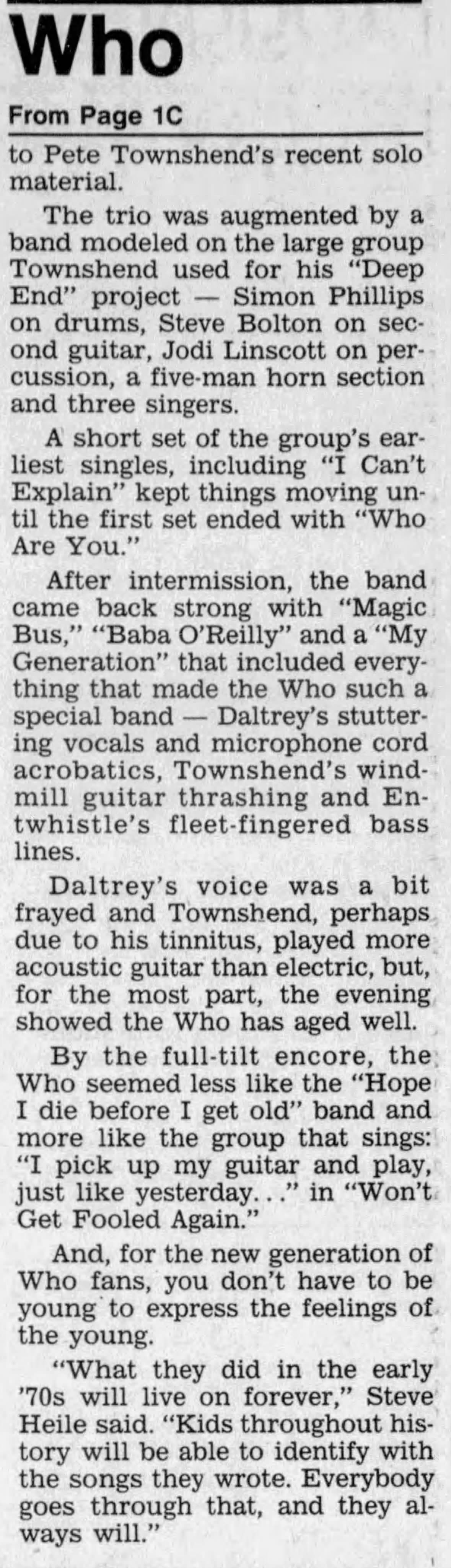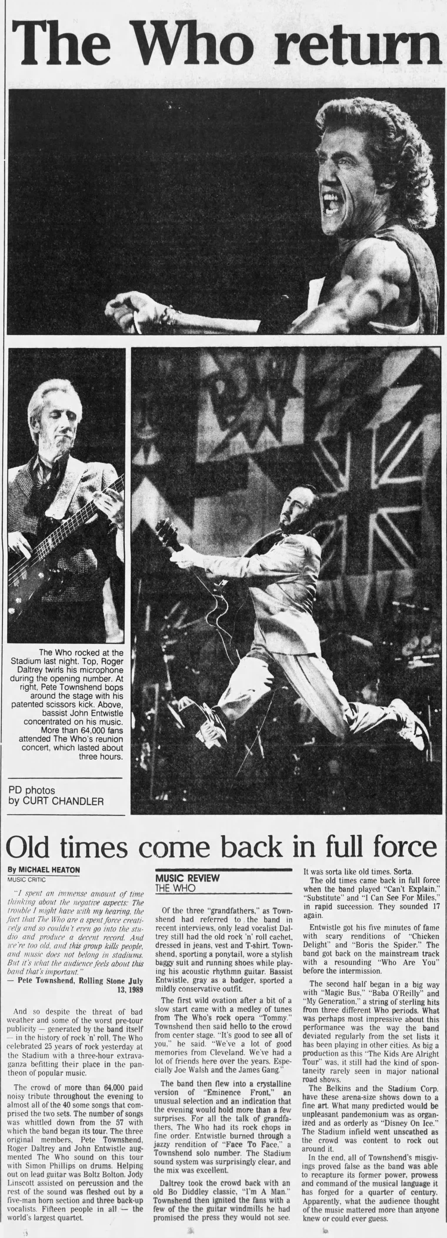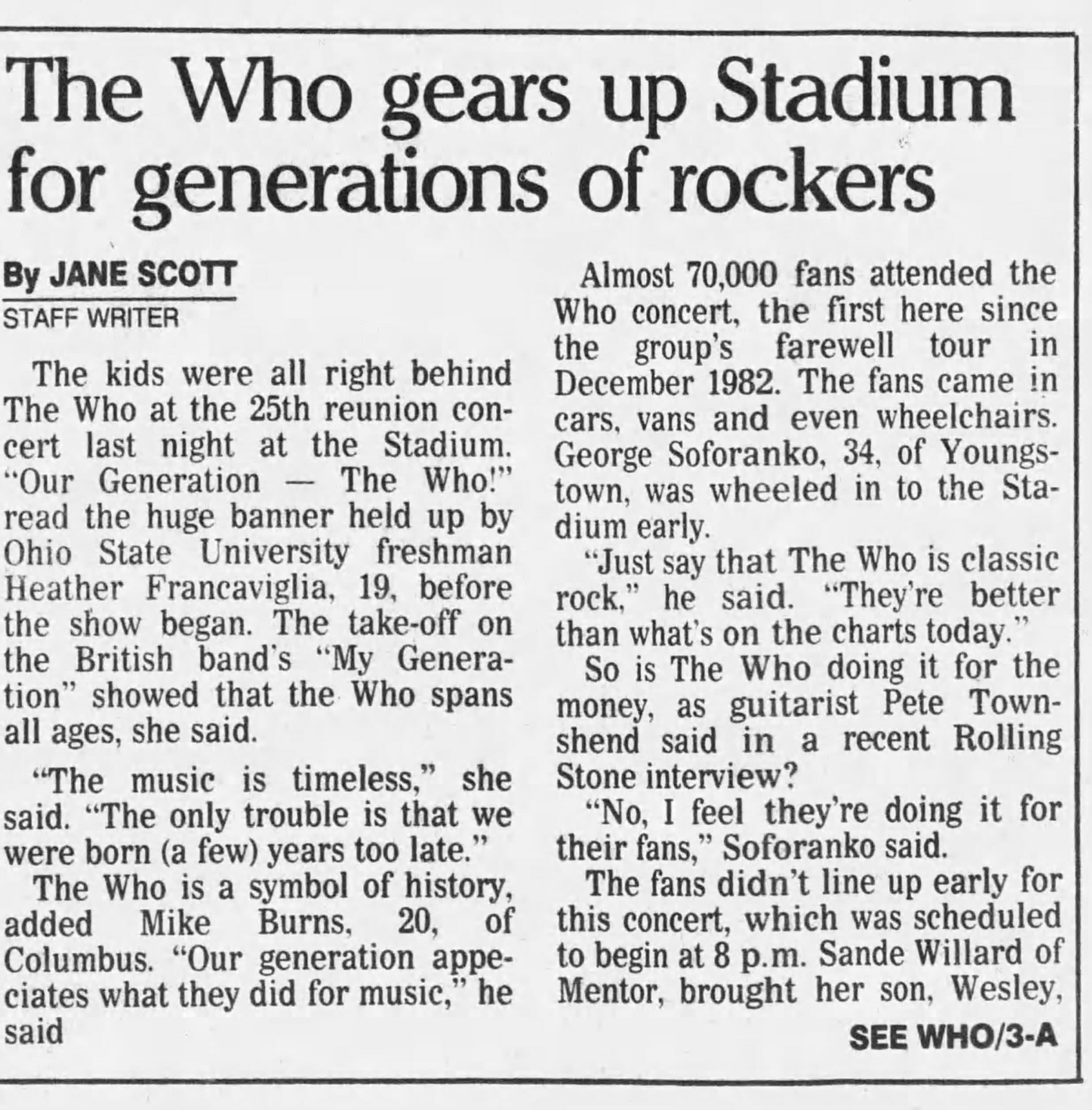 Wednesday, July 19th, 1989 The Who play Cleveland Stadium in Cleveland, Ohio « 1989-07-18 1989-07-21 » WhoTube Newspapers 1989-07-20-Telegraph_Forum 1989-07-20-The_Akron_Beacon_Journal_1 1989-07-20-The_Akron_Beacon_Journal_2 1989-07-20-The_Cincinnati_Post_1 1989-07-20-The_Cincinnati_Post_2 1989-07-20-The_Plain_Dealer_1 1989-07-20-The_Plain_Dealer_2 1989-07-20-The_Plain_Dealer_3 1997-07-21-The_Plain_Dealer http://www.archive.org/serve/Who1989-07-19MunicipalStadiumClevelandOH/Who1989-07-19MunicipalStadiumClevelandOH.mp3 Comments Leave a Reply Cancel replyYou must be logged in to post a comment. This site uses Akismet to reduce spam. Learn how your comment data is processed. Map Venue Cleveland Stadium, Cleveland I was there Latitude: 41.505806 Longitude: -81.700060 For more information on The Who’s history and concerts visit our friends www.thewhothismonth.com www.thewholive.com
